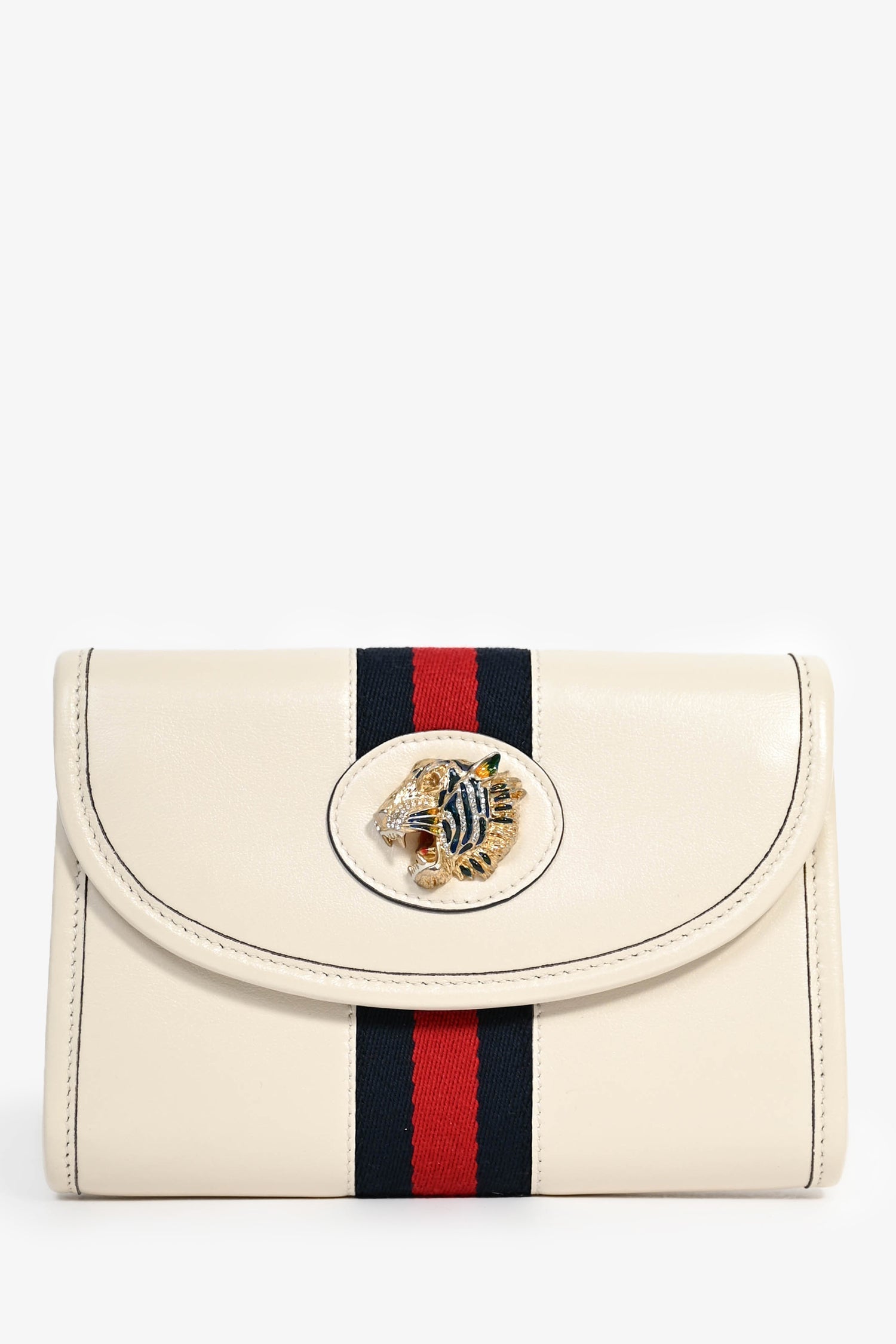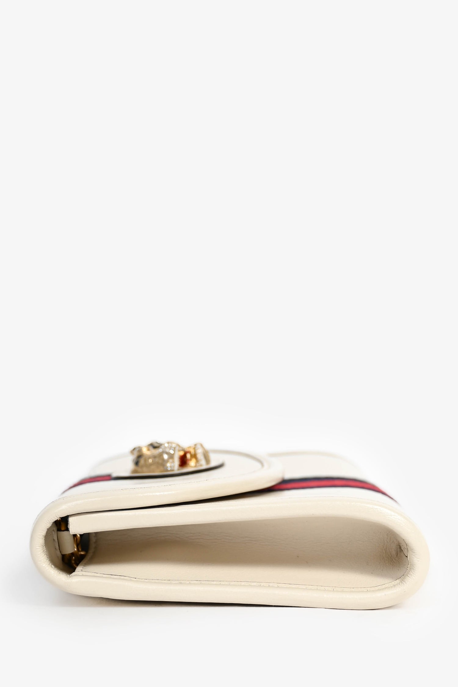 Gucci Cream Leather Web Mini Rajah Clutch. Fold-over flap with a snap closure. Gold and silver-tone hardware with embellishments. Chain-link strap. Lined interior with 2 card pockets. Tonal stitching.