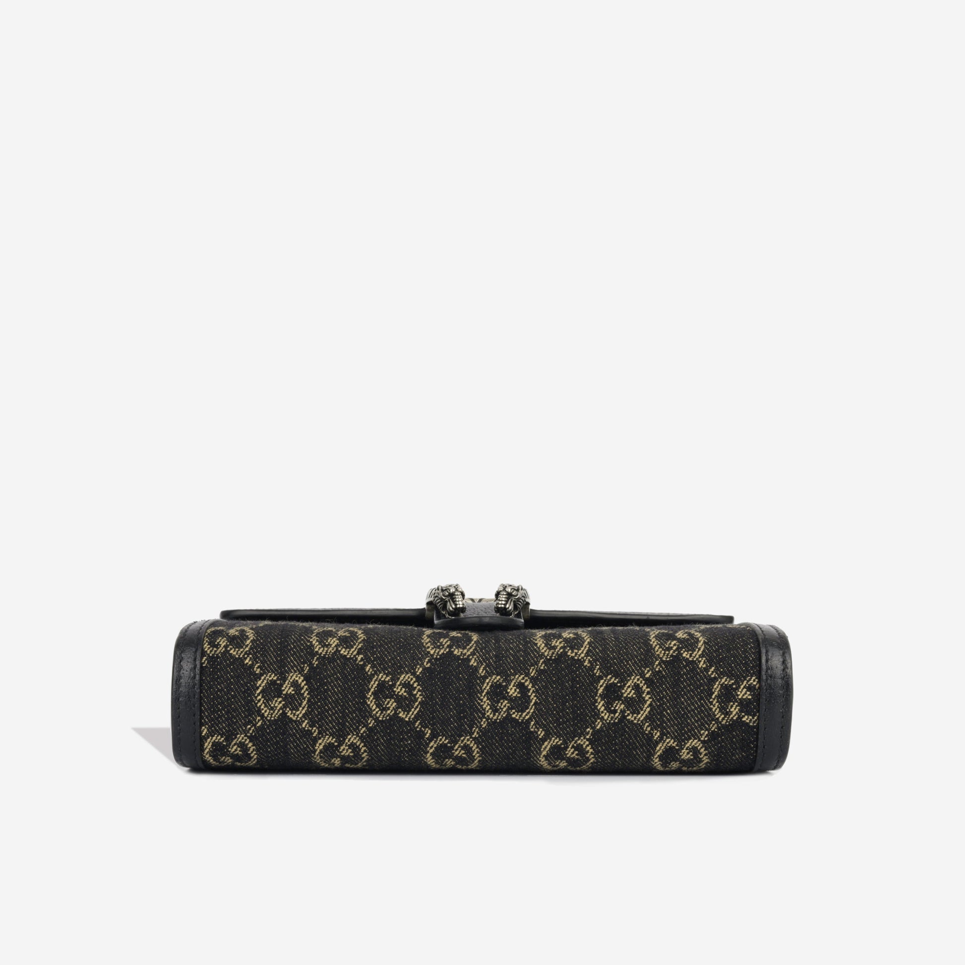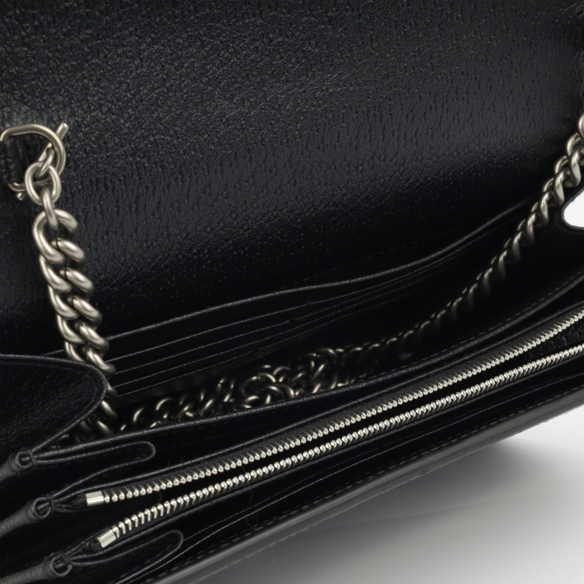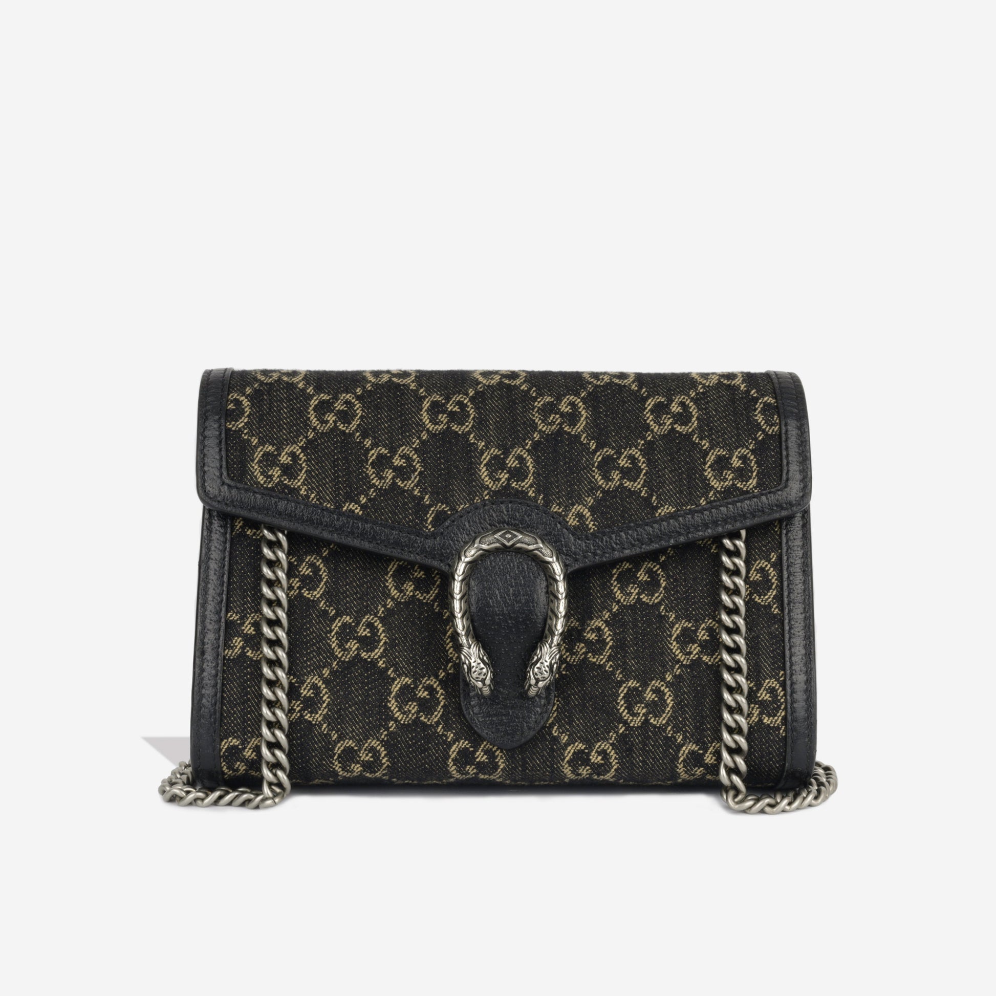The very popular Gucci signature GG motif has been worked into the classic Dionysus Chain Wallet. Made in Italy, the Dionysus shoulder bag is suspended from a shoulder chain that can be worn multiple ways. The tiger head remains an eye catching feature on this defining silhouette. The Dionysus Chain Wallet is the perfect statement handbag to be added to any collection, and perfect classic piece for your next night out.