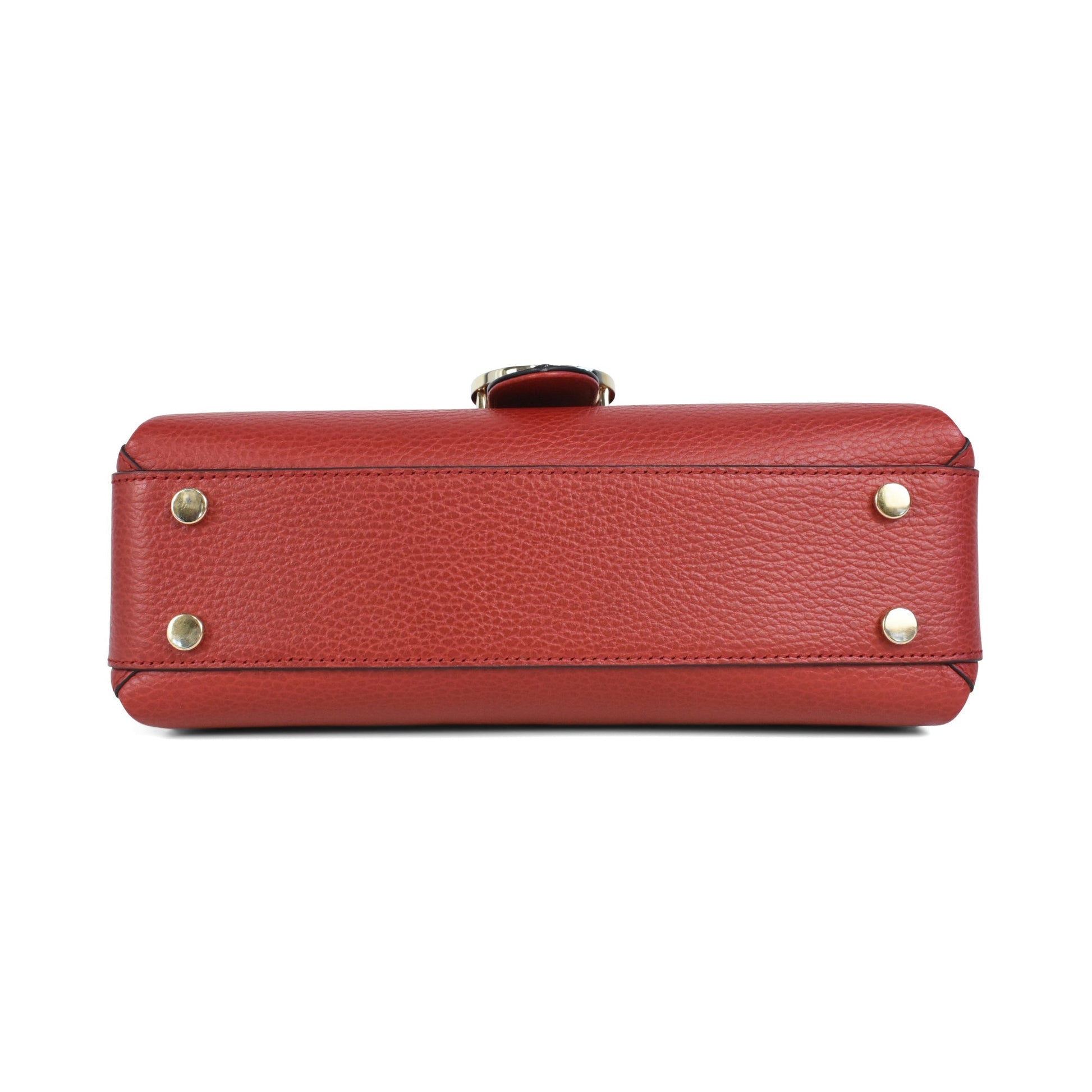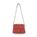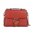 Gucci 'Dollar Interlocking G' crossbody bag in red leather with a leather top handle and a soft gold chain crossbody strap. The bag has a top flap opening with a gold interlocking 'G' clasp revealing a beige canvas inner lining with dual storage compartments and a zip pocket.