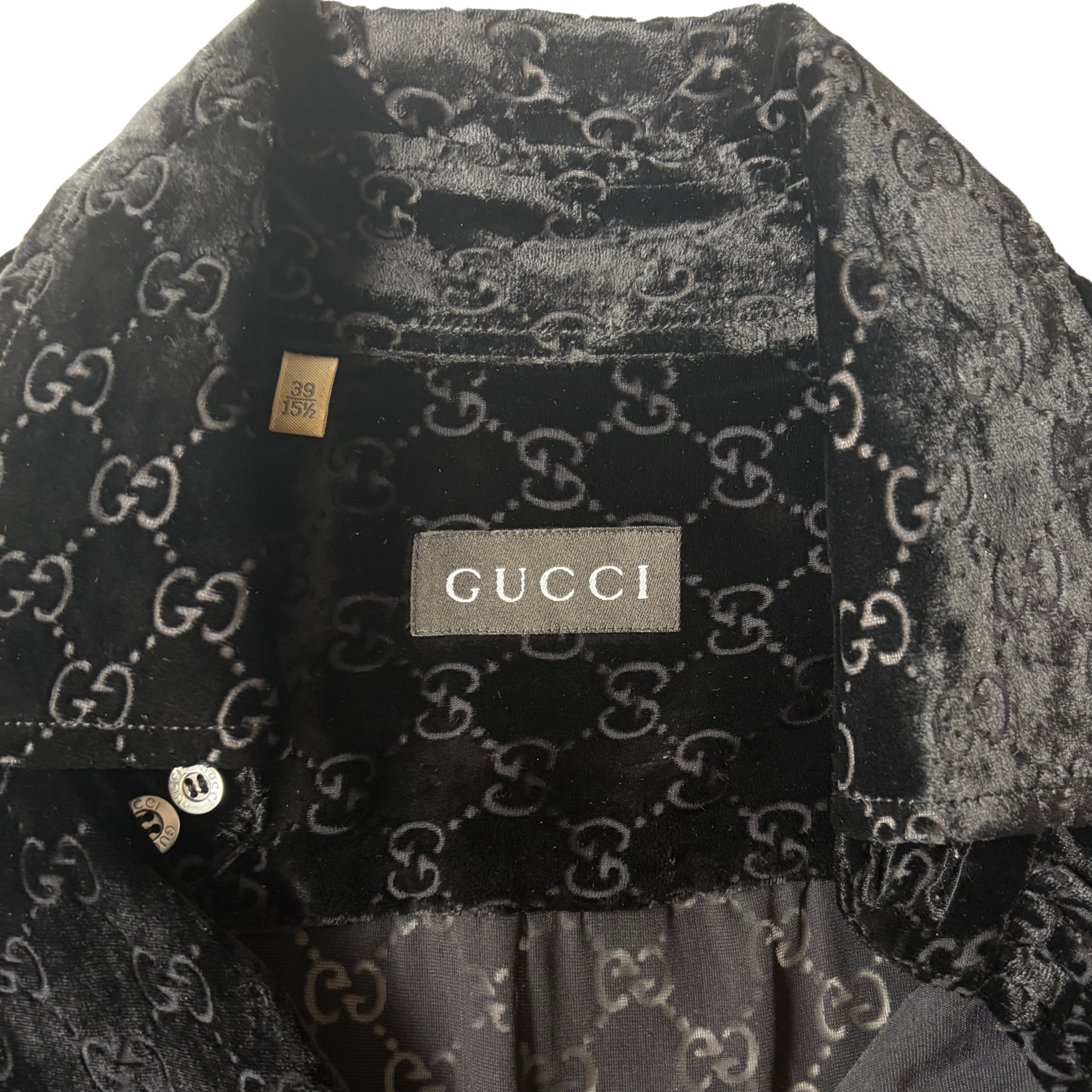 Gucci vintage oversized button-down shirt in black velvet with an all-over 'GG' monogram print, mother of pearl buttons, and a collar.