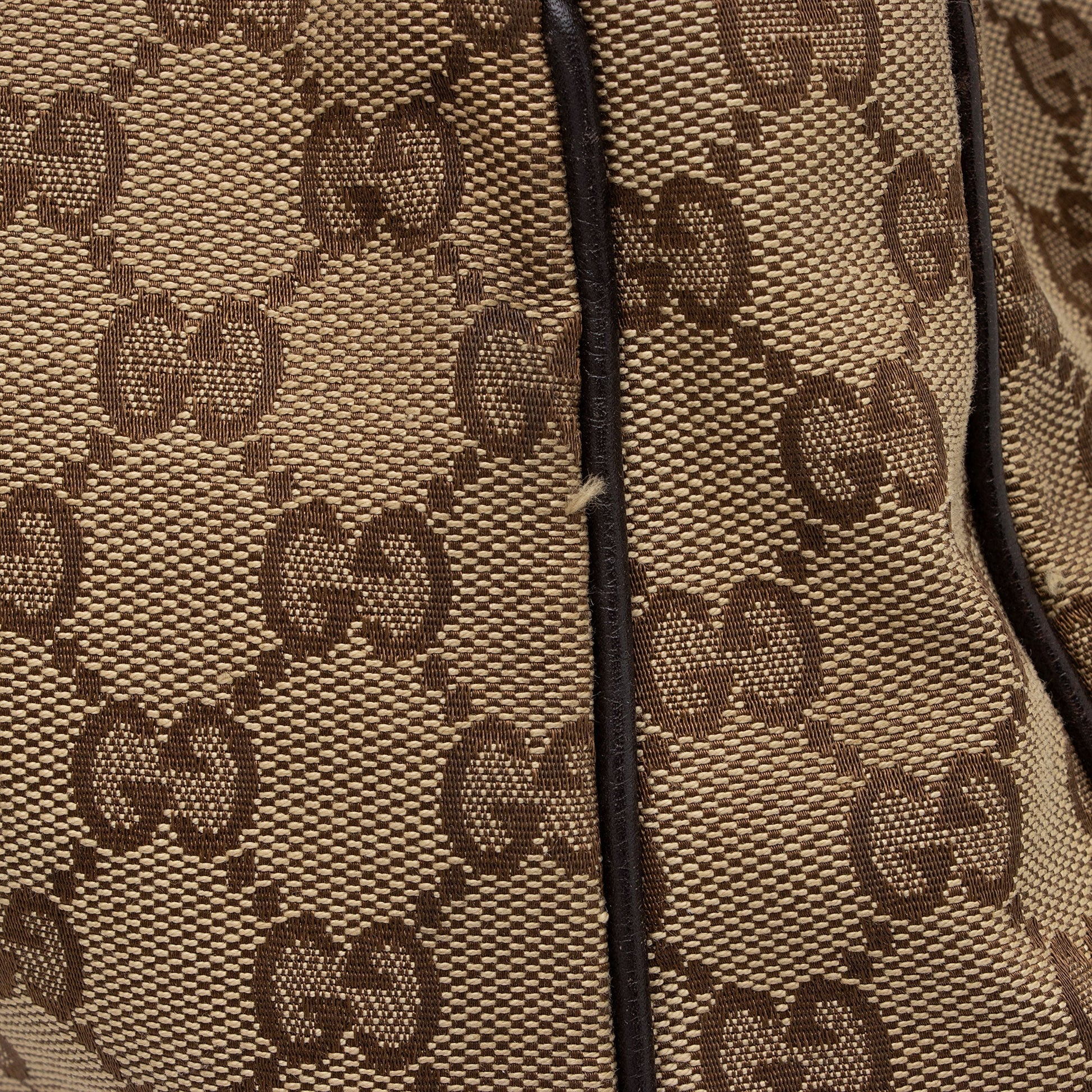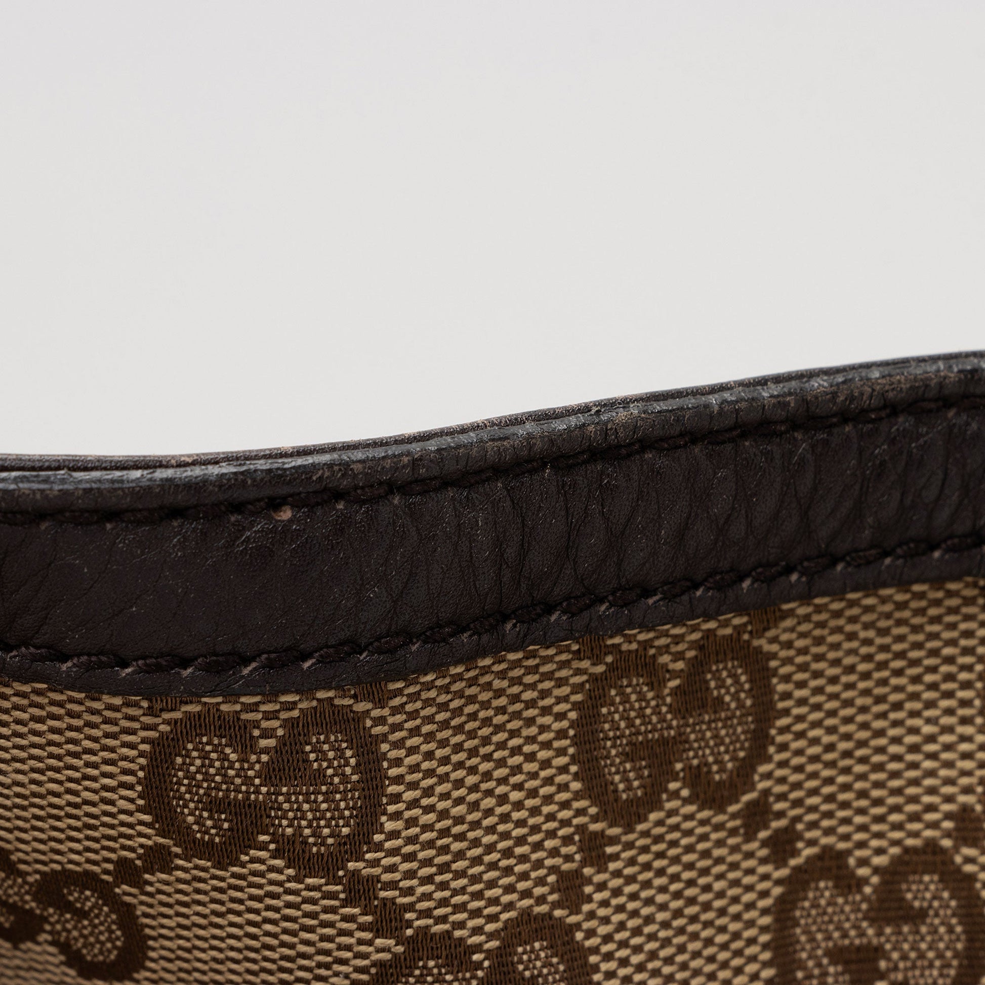 Condition Notes: Visible scuffs to exterior bottom corners. Creasing and light scuffs throughout exterior leather trim and shoulder strap. Wear throughout shoulder strap casing. Marks and light darkening throughout exterior canvas. Surface scratches to hardware. Marks and wear throughout interior.