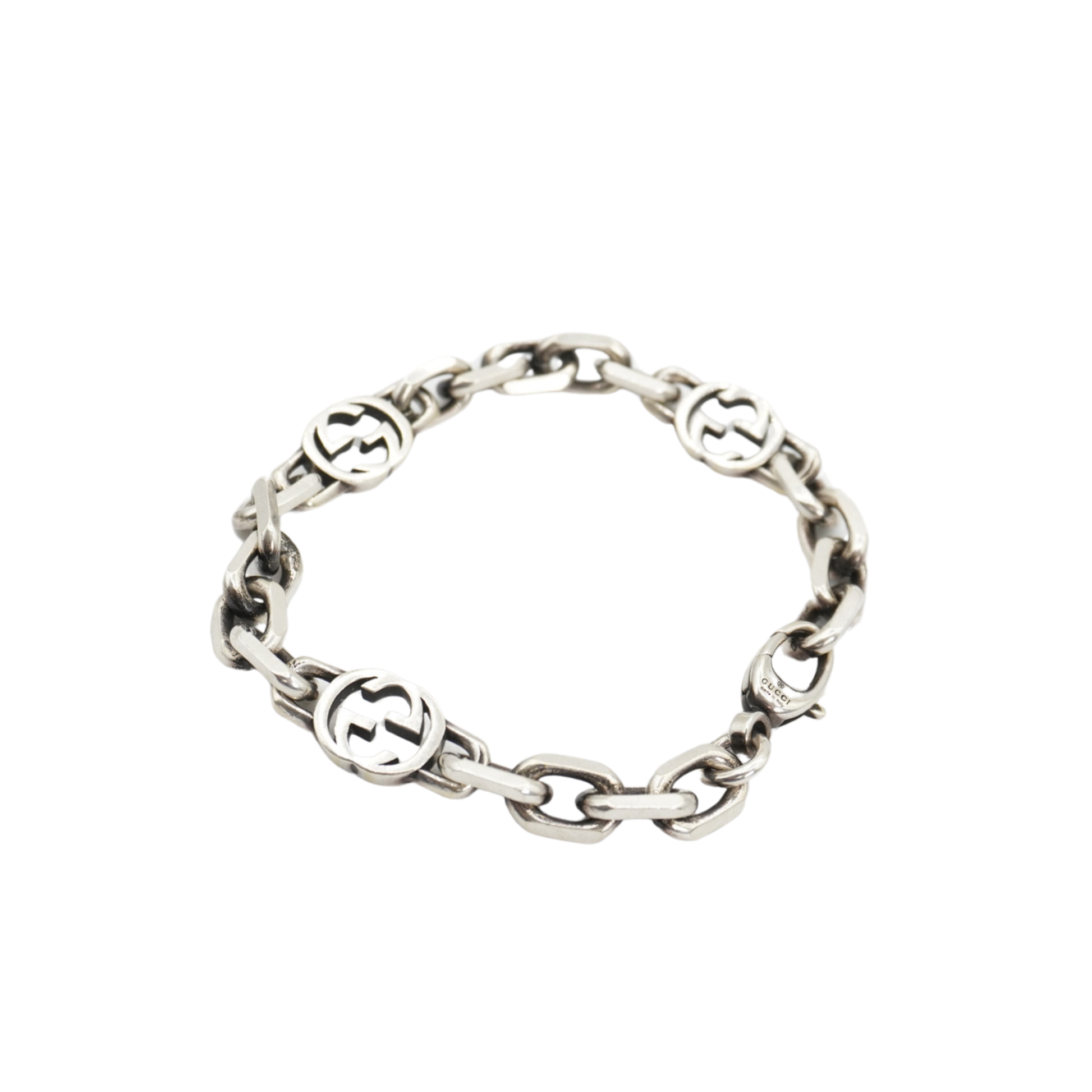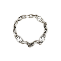Gucci chainlink bracelet in pre-tarnished sterling silver with three interlocking GG logo links and a lobster claw closure.