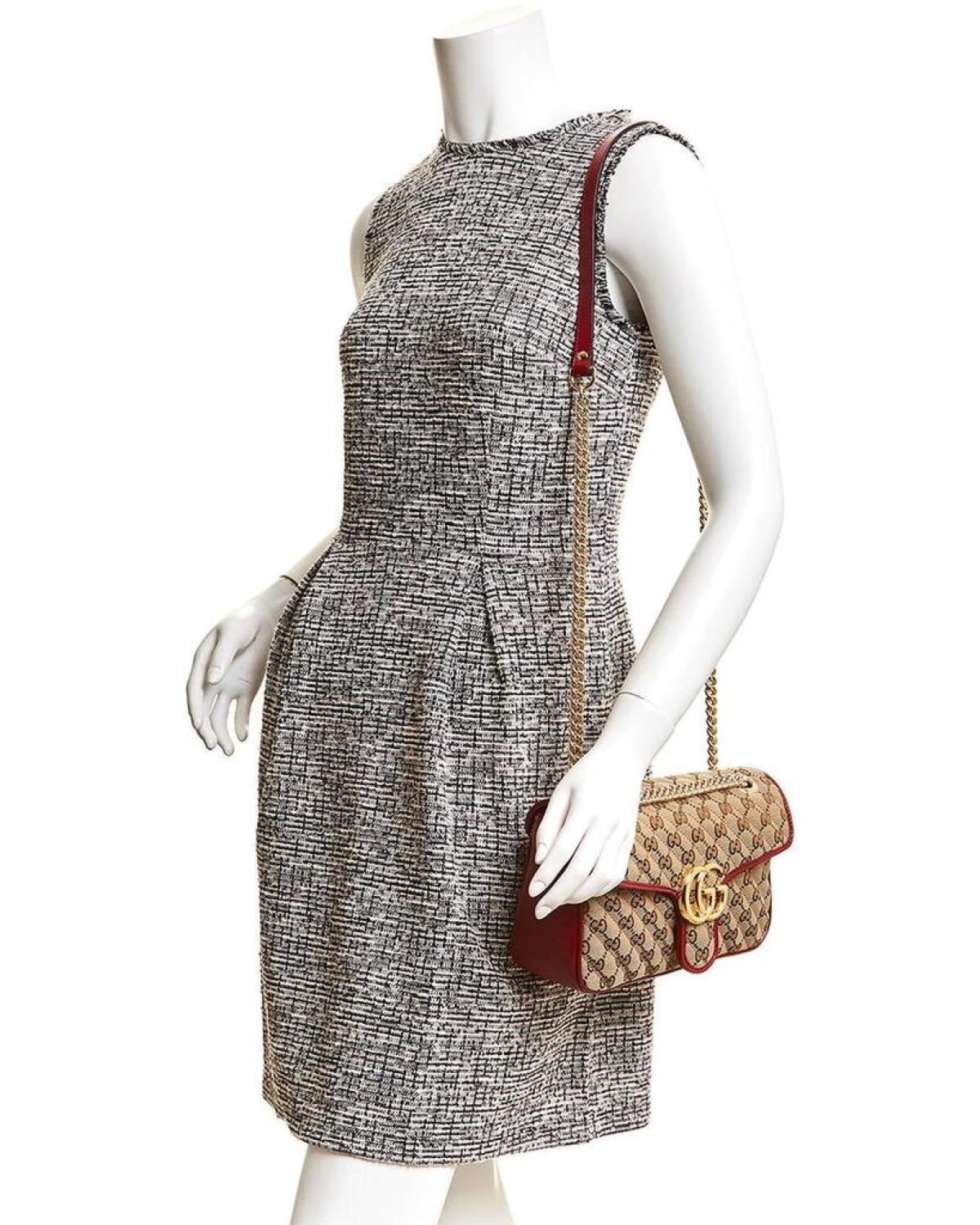 Elevate your style with the Gucci GG Marmont Small Canvas & Leather Shoulder Bag. This luxury handbag is a perfect blend of Italian craftsmanship and modern design. Made in Italy, this bag features GG canvas and red leather with light fine gold hardware and the iconic interlocking G logo. The interior is lined with fabric and includes a convenient pocket for your essentials. The bag measures 10 inches wide by 6 inches high by 3 inches deep, with top handles with a 12-inch drop and an adjustable shoulder strap with a 22-inch drop. The fold-over flap closure is accented with a chic pushlock detail.Please note that all measurements are approximate and may vary slightly. Rest assured that this Gucci bag is genuine and . Add this statement piece to your collection and experience the eclectic and coveted world of Italian luxury redefined.