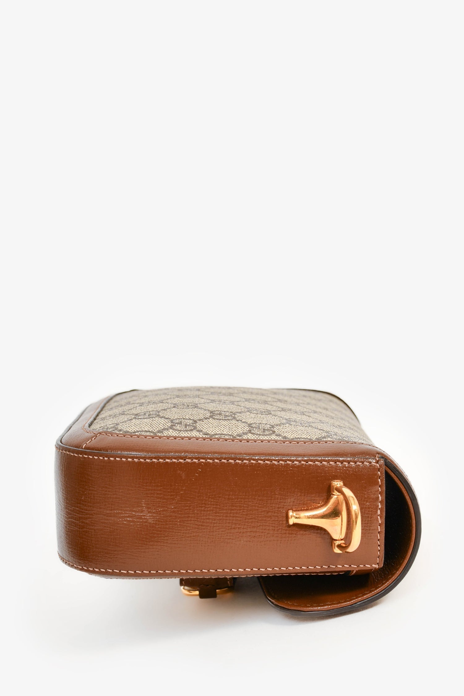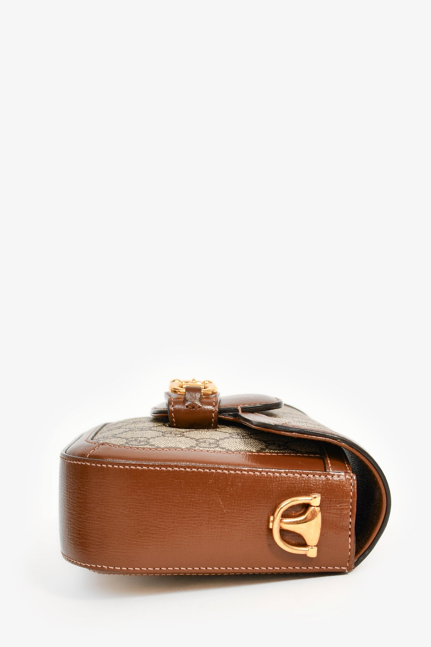 Gucci GG Monogram/Brown Leather 'Horsebit 1955' Small Shoulder Bag. Gold-tone hardware. Fold-under flap. Leather trimming. Monogram canvas. Lined canvas interior. 1 green and red-tone signature web strap. 1 adjustable shoulder strap. Tonal and contrast stitching.