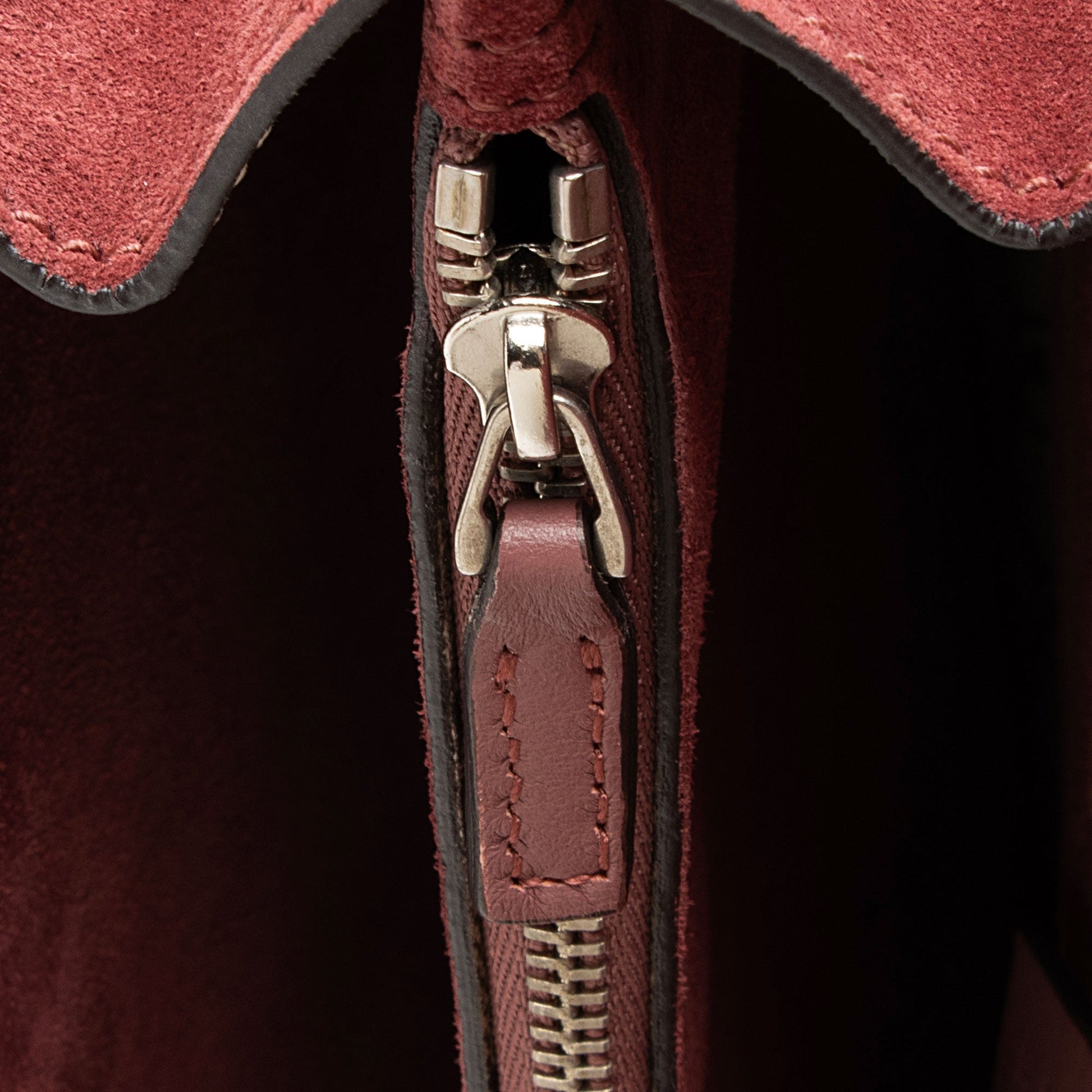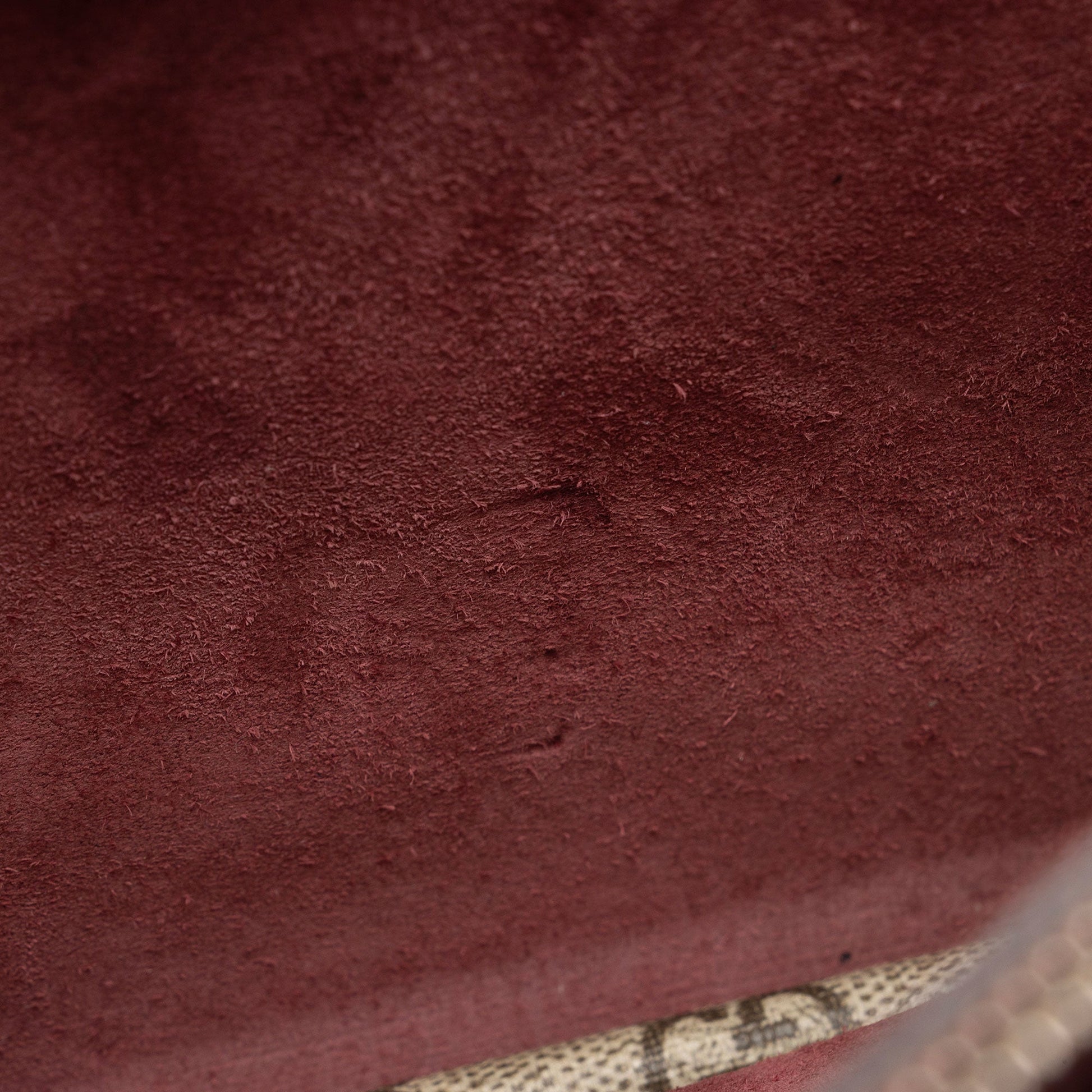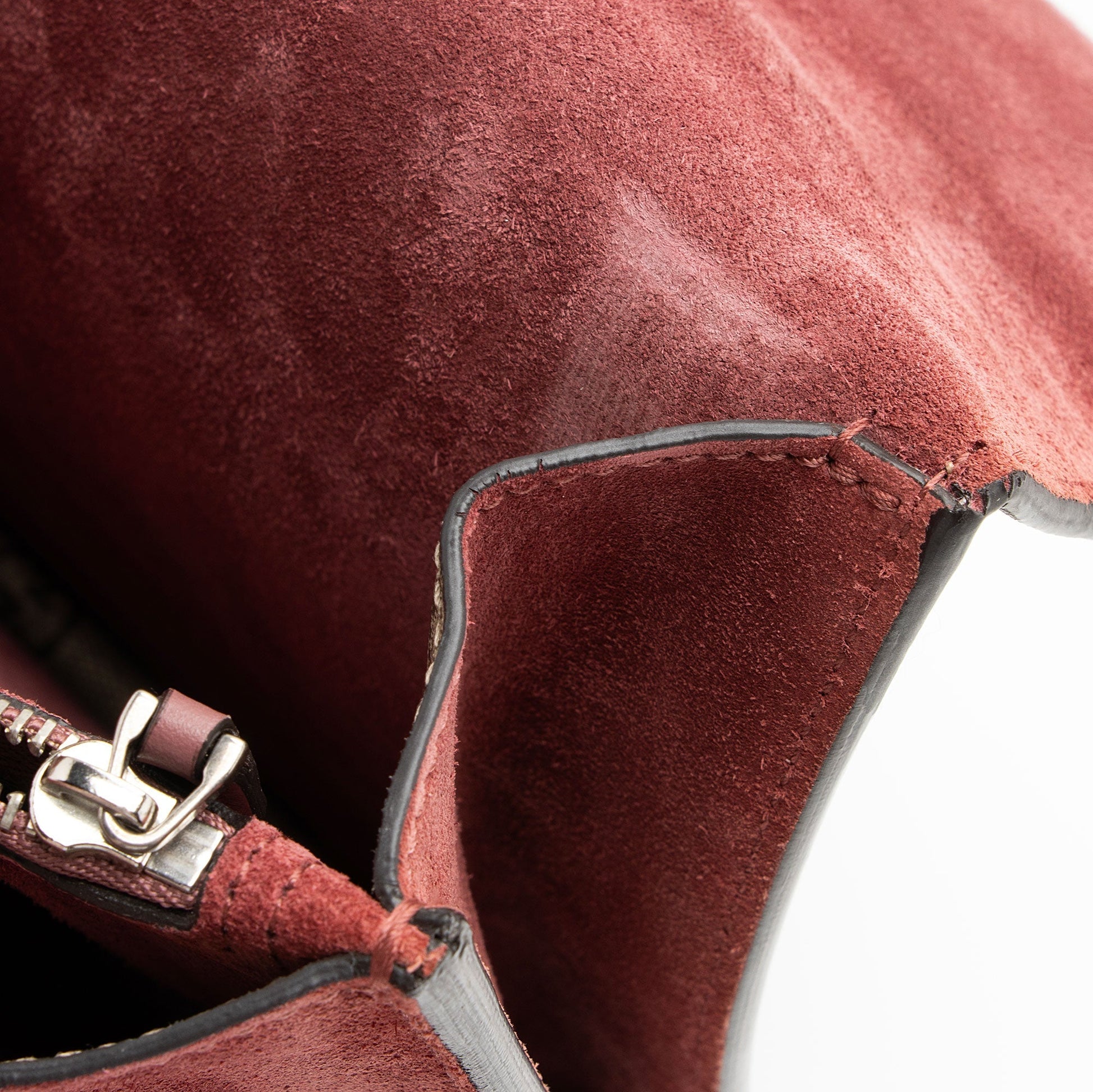 Condition Notes: Scuffs, marks, and minor darkening throughout exterior suede. Minor wear to exterior bottom corners. Light surface scratches to hardware. Visible scuffs and wear throughout interior.