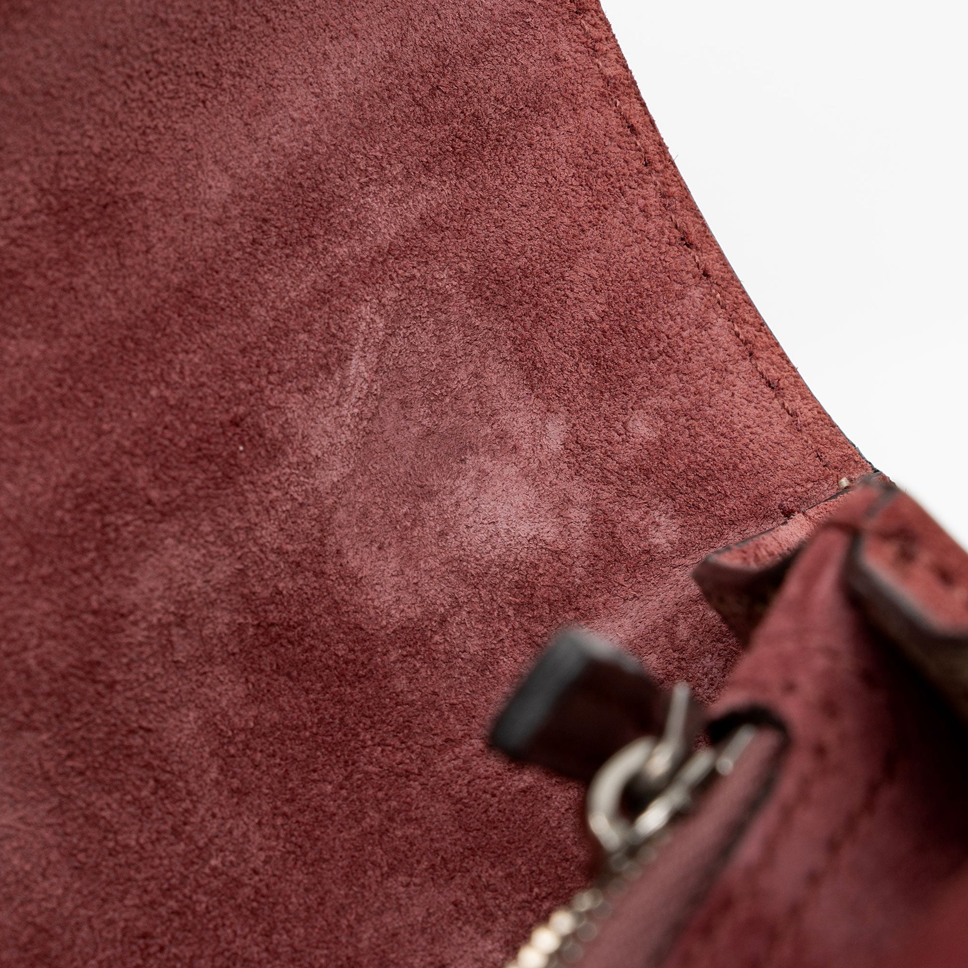 Condition Notes: Darkening and marks throughout exterior suede. Minor wear to exterior bottom corners. Minor surface scratches to hardware. Marks and scuffs throughout interior.