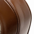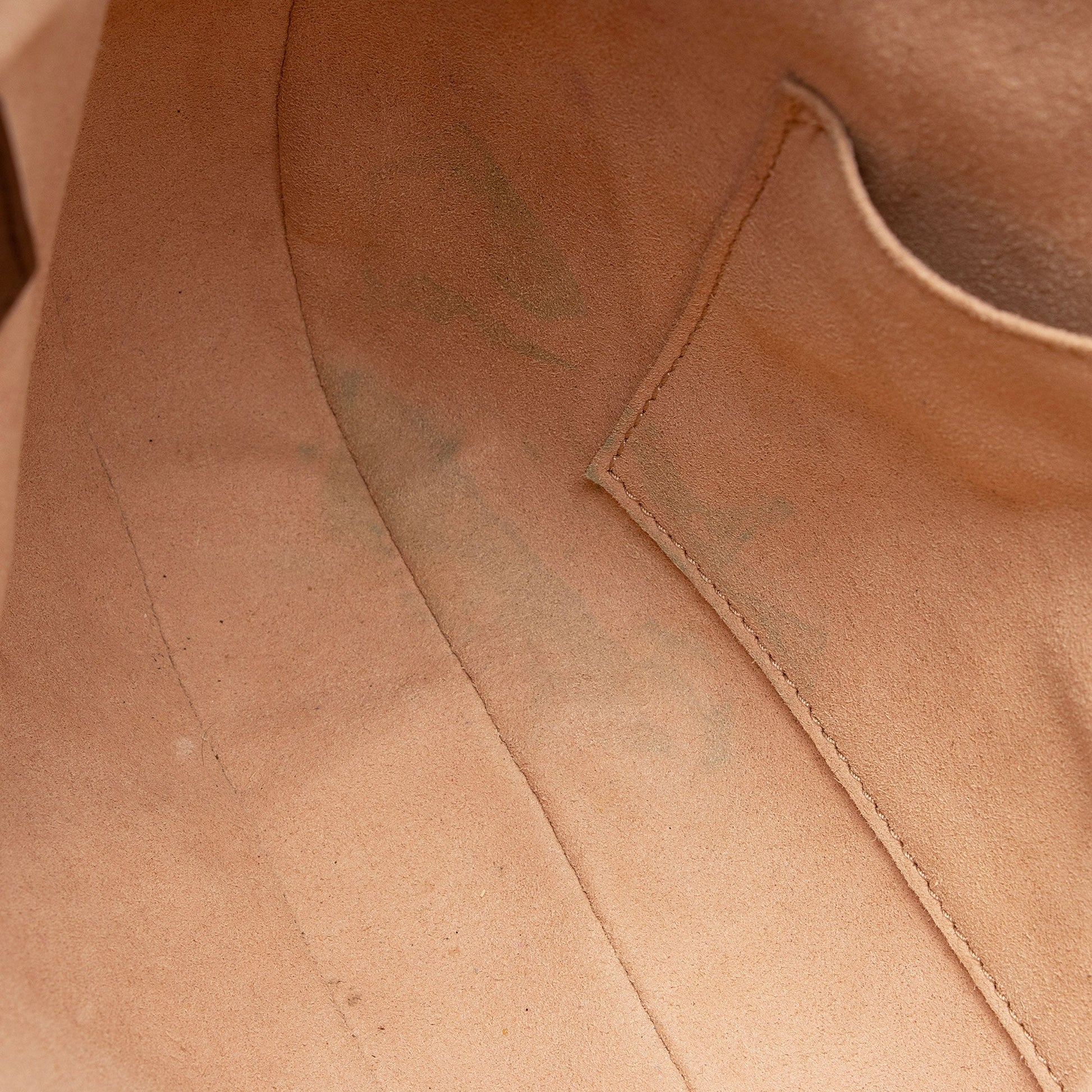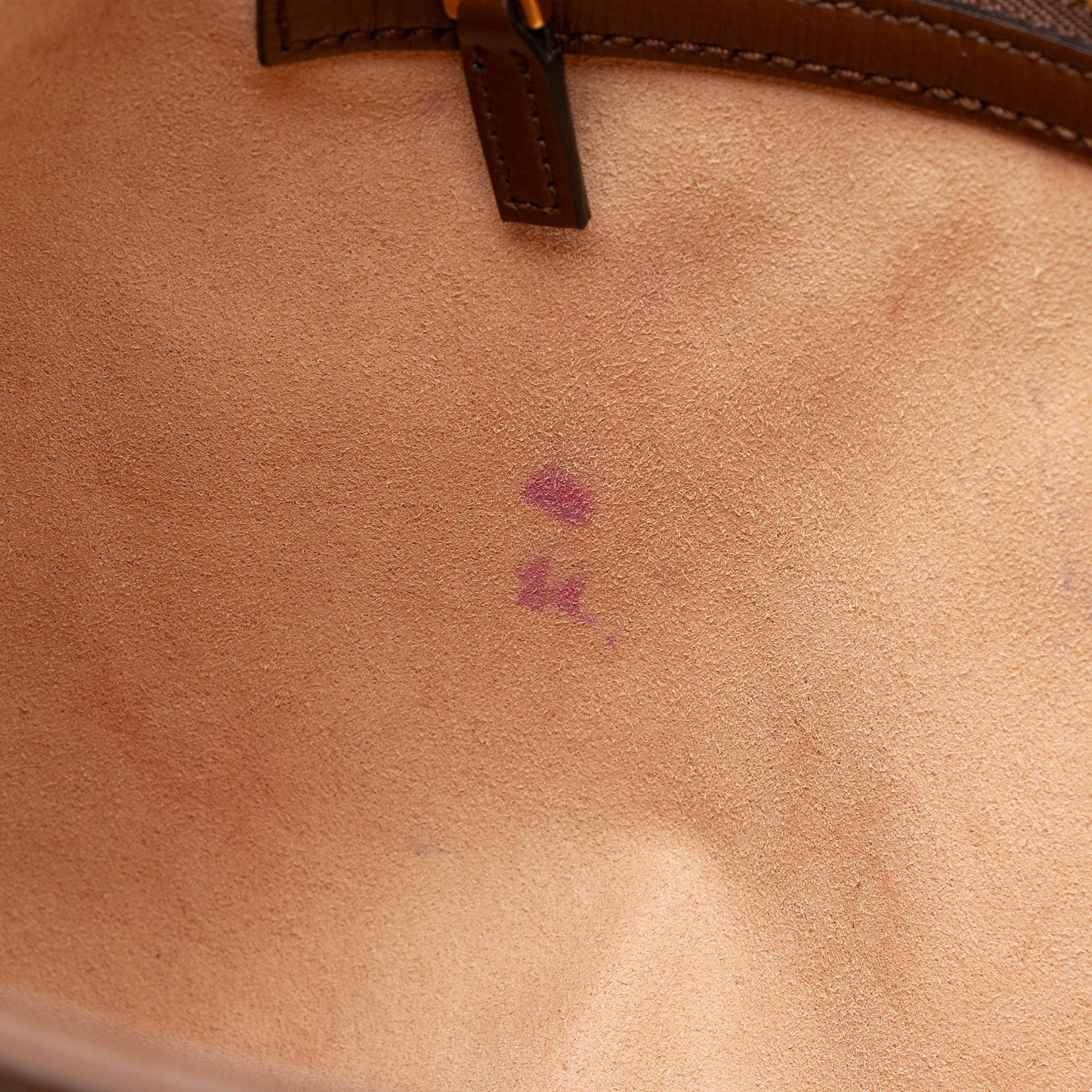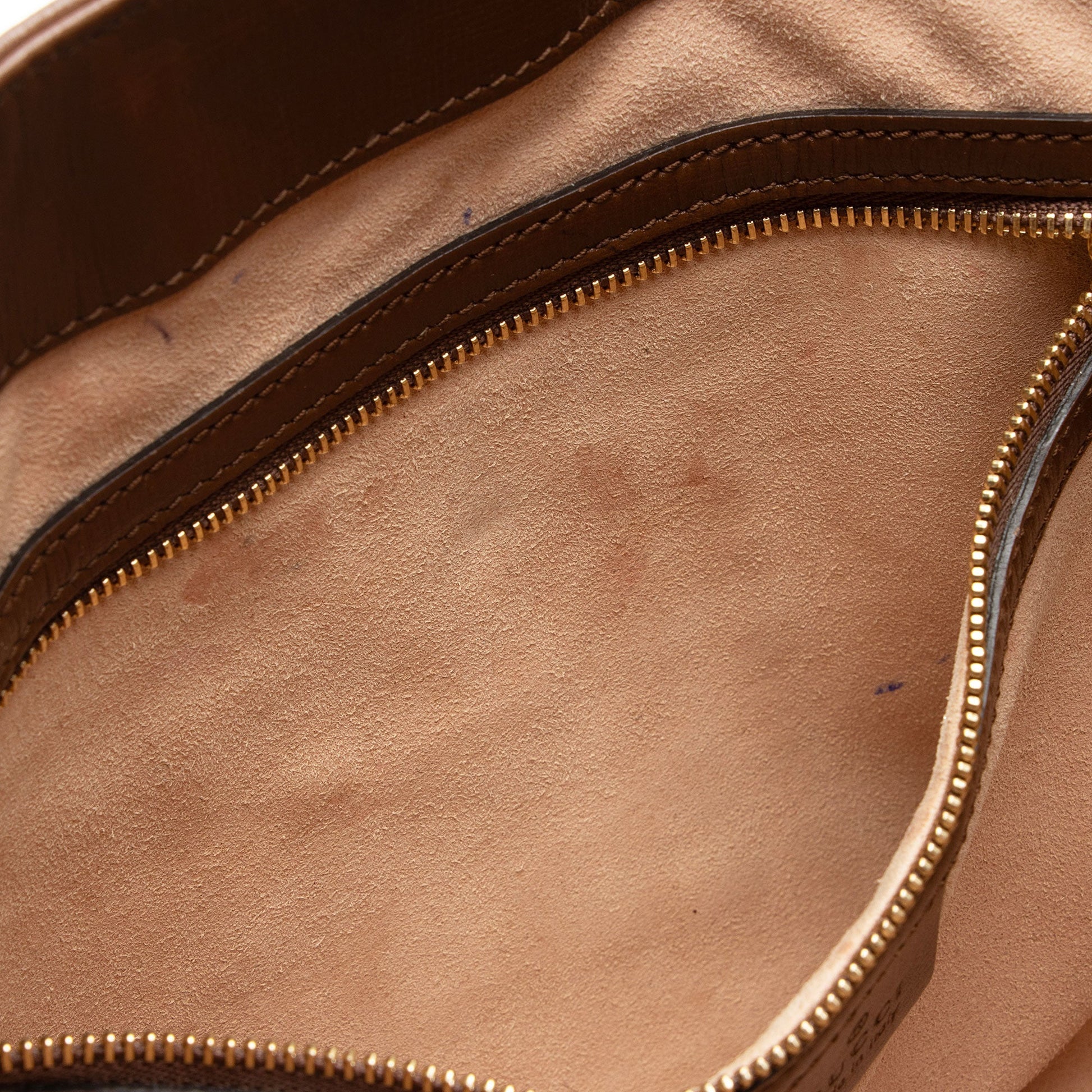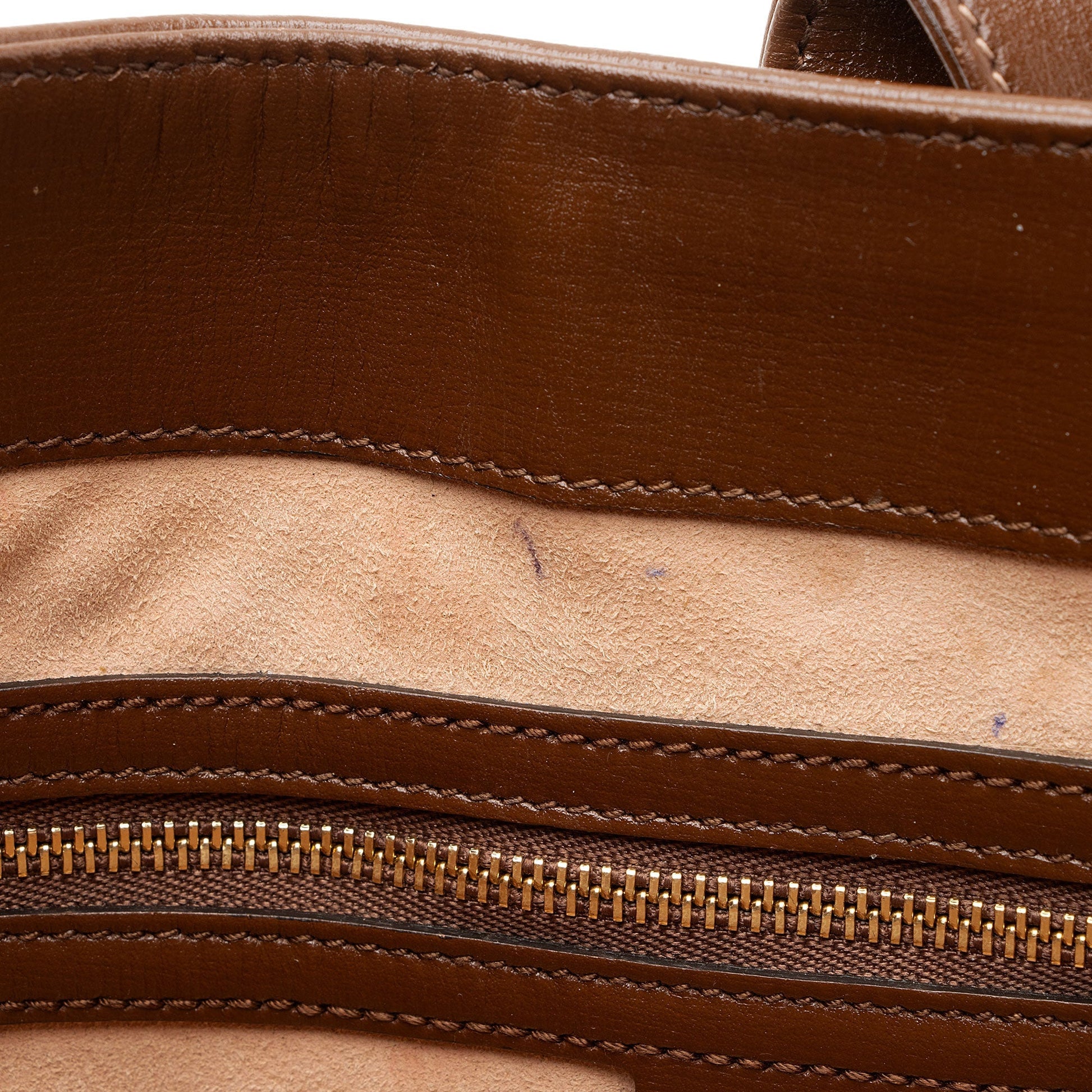 Condition Notes: Visible scuffs and light creasing throughout exterior leather trim and handle. Surface scratches to hardware. Ink marks, marks, and light darkening throughout interior and interior pocket.