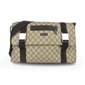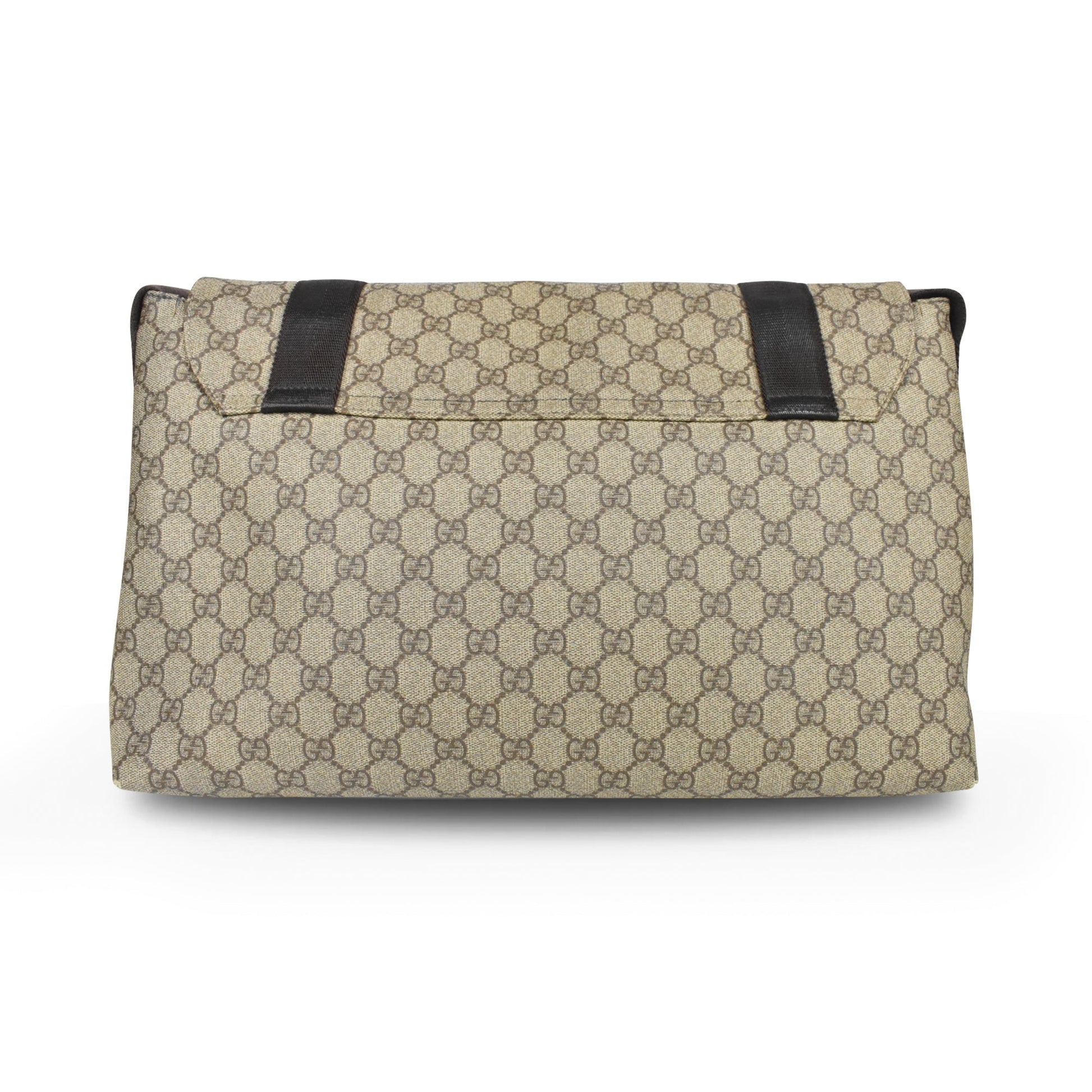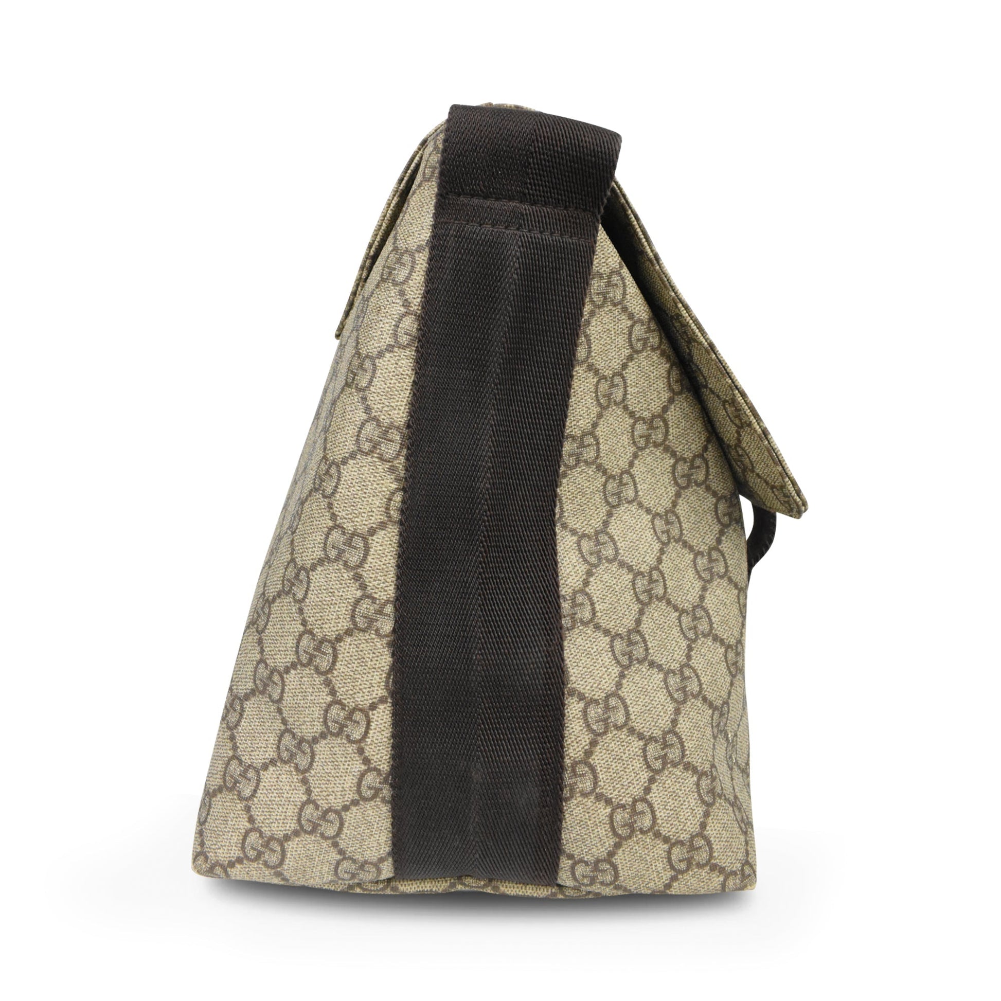 Gucci 'GG Supreme' rectangular messenger bag in beige and brown monogram coated canvas with brown canvas adjustable long strap. Features silver buckle hardware top flap closure and a zip pocket on the front. The interior is brown canvas lined with a zip pocket and two small slip pockets.