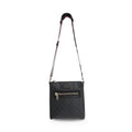Gucci 'GG Supreme' messenger bag in black and grey monogram printed coated canvas with black leather trim, a front zip pocket in silver hardware and an adjustable red and navy canvas racing stripe crossbody strap. The bag has a top-zip opening in silver hardware revealing a black canvas interior lining with a zip pocket.