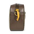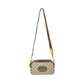 Gucci 'GG Supreme Neo Vintage' camera bag in beige and brown 'GG' monogram coated canvas with brown leather sides. Features a removable red and green racing stripe canvas crossbody strap with gold hardware clamps, brown leather logo patch on the front with gold foil logo and gold hardware tiger head, and a zip closure with a yellow leather zipper pull. The interior is cream and pink floral patterned lined with a slip pocket.