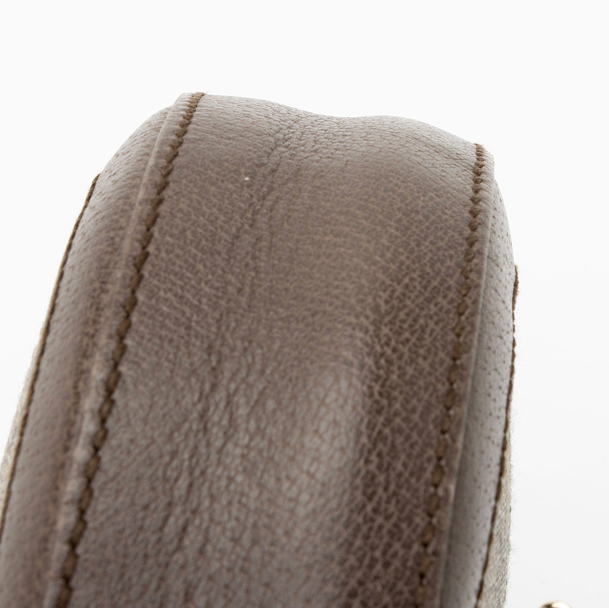 Condition Notes: Light creasing and scuffs throughout exterior leather trim. Surface scratches and tarnishing to hardware. Marks and minor darkening throughout interior.