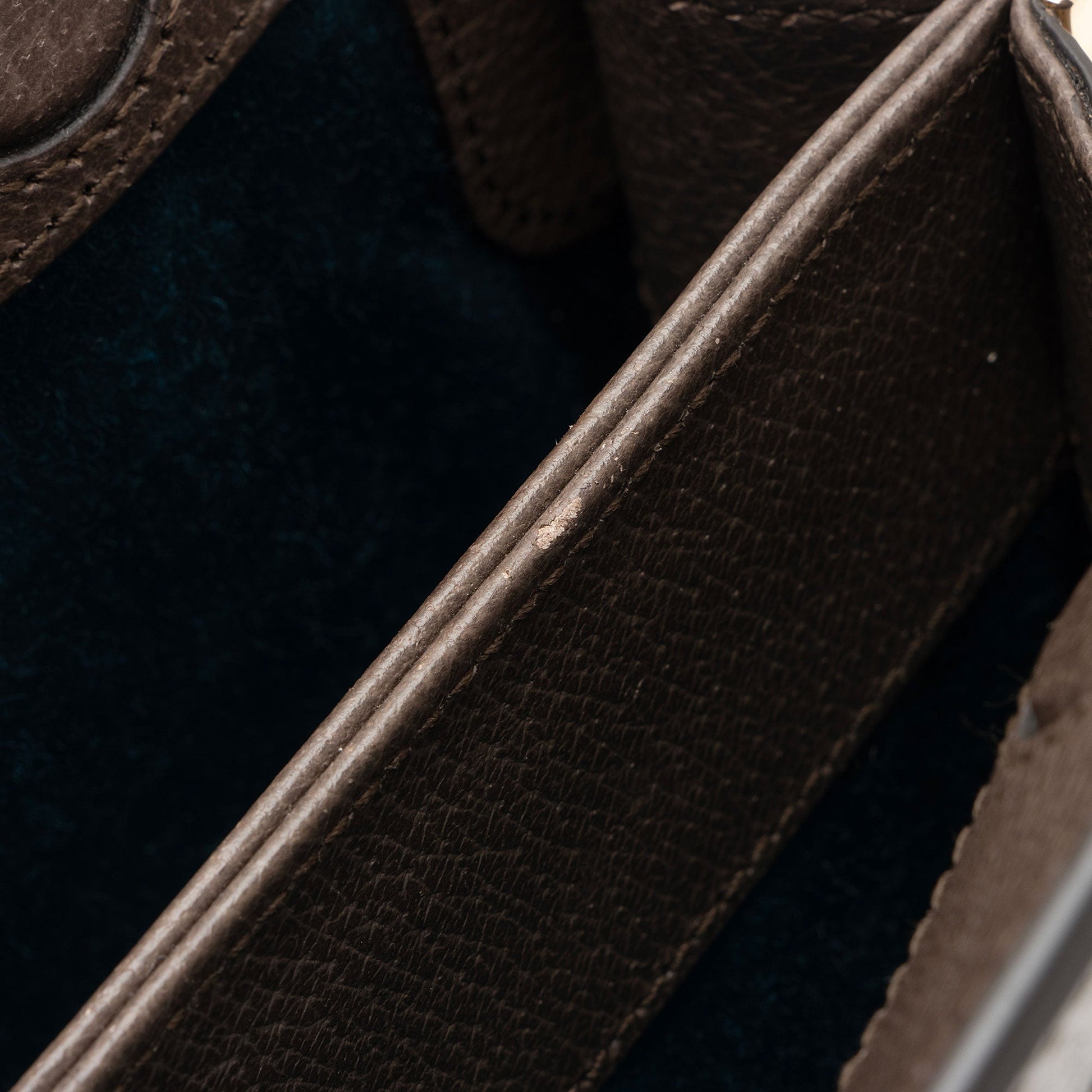 Condition Notes: Minor scuffs to exterior bottom corners. Minor creasing to exterior base leather trim. Light surface scratches to hardware. Light marks throughout interior.