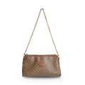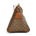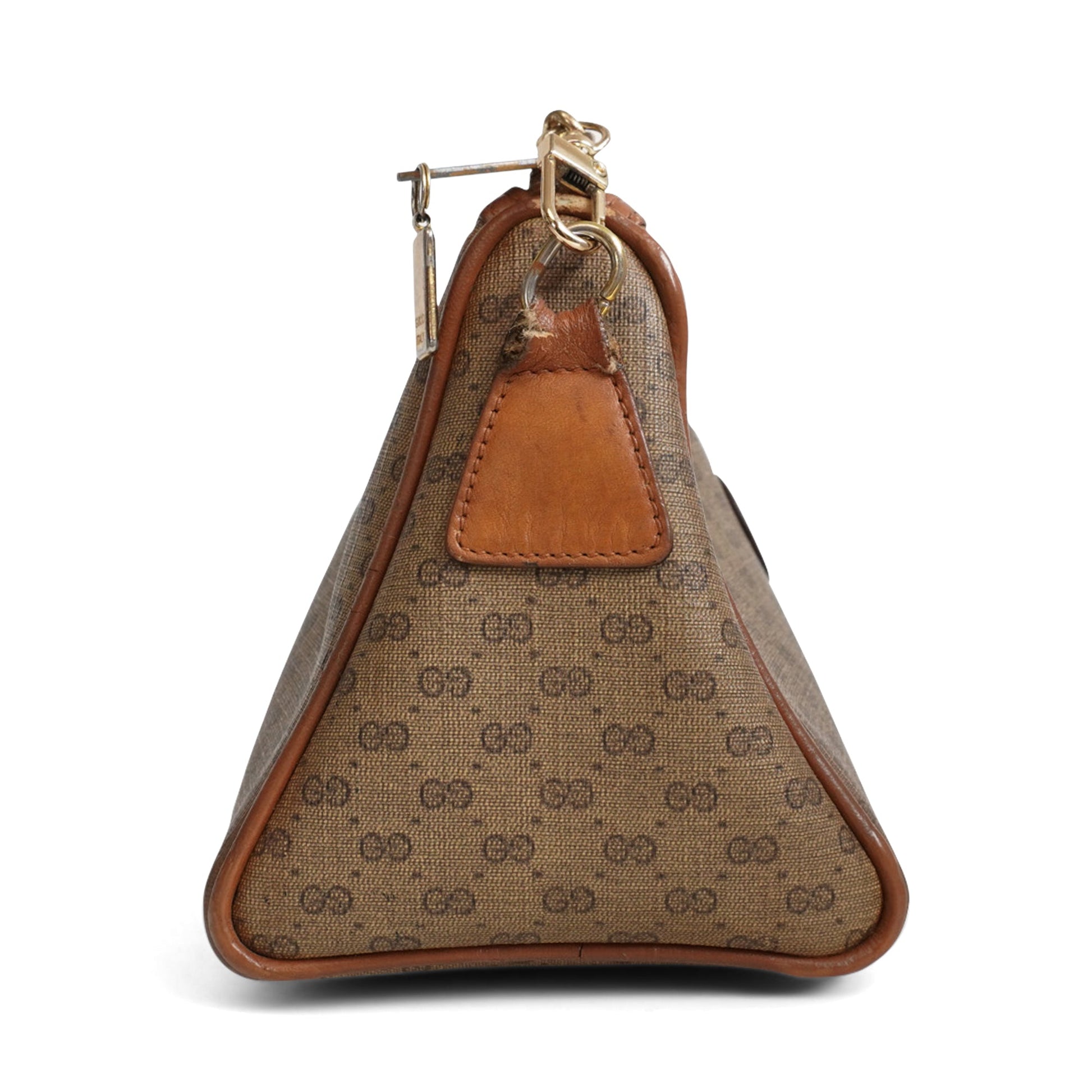 Gucci 'GG Supreme' pouch bag in camel coated canvas with a micro GG monogram print with a brown leather logo on the front and dark brown leather trim. Interior features on slip zipper pocket and beige felt lining.