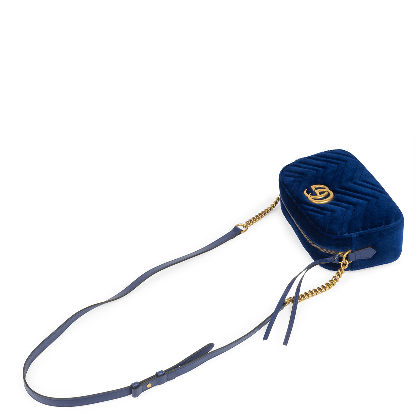 Gucci presents its highly-acclaimed GG Marmont in royal blue velvet. Crafted from the fashion house’s quintessential chevron design, this handbag also features a GG logo stitch on its rear. The GG Marmont is also accented with antique gold hardware, complimenting the romantic hue. The bag’s opens up to showcase a magnificent pink satin lining, presented in a single storage compartment. Ideal for day-to-night usage, the GG Marmont is perfect for styling with anything you may have in your wardrobe.