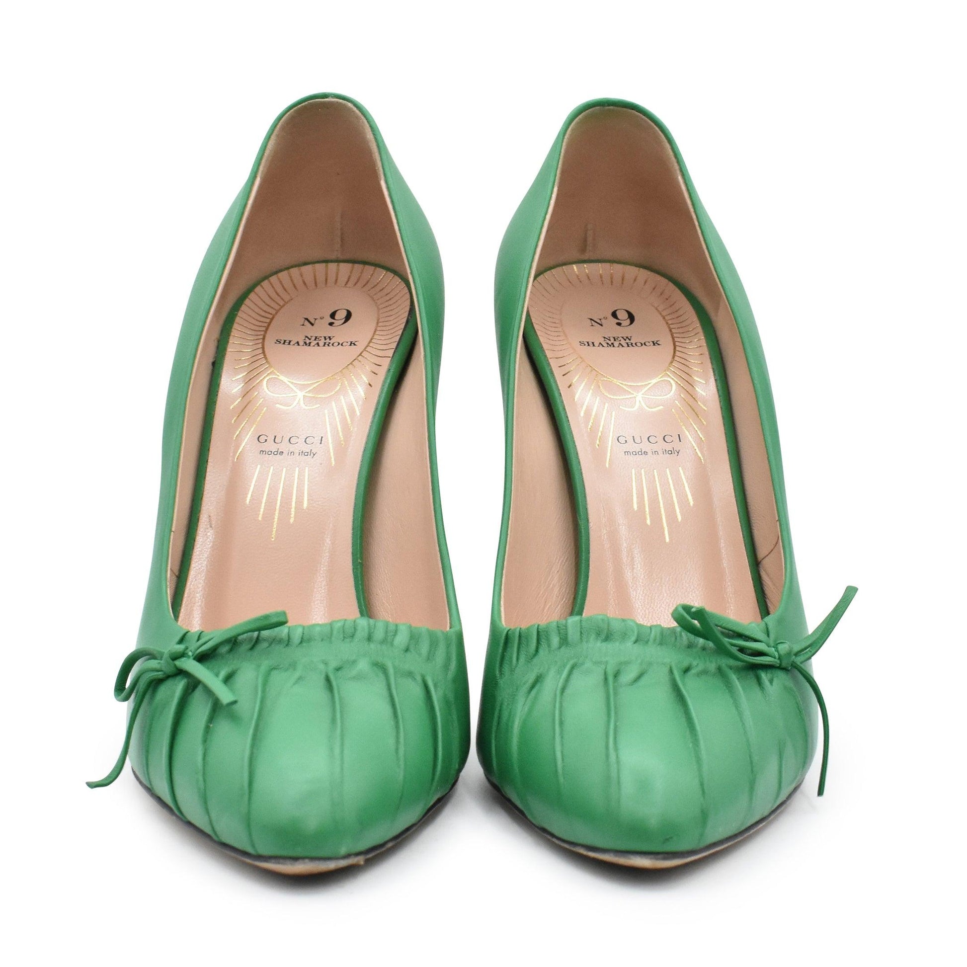 Gucci 'Charlotte' pumps in N.9 Shamrock green nappa leather with gathered and bow detail at the rounded toe.