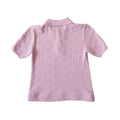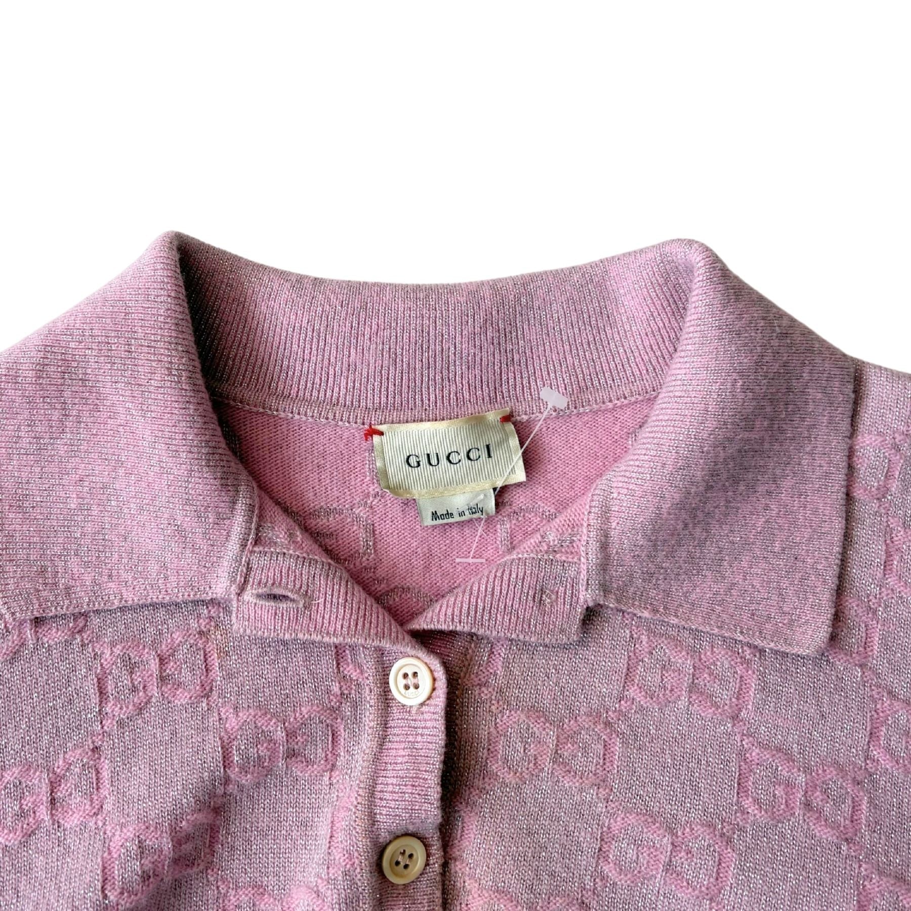 Gucci re-worked polo shirt in pink metallic knit with an all-over 'GG' guccissima print, beige buttons, and a collar. This top was re-worked from a dress.
