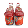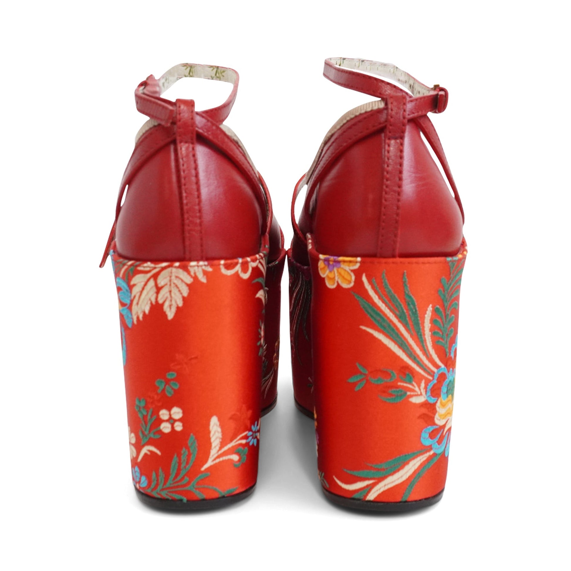 Gucci 'Hannelore Detachable Platform' slip-on wedges in red floral jacquard with detachable leather flats, tonal stitching, and buckle closures at uppers.