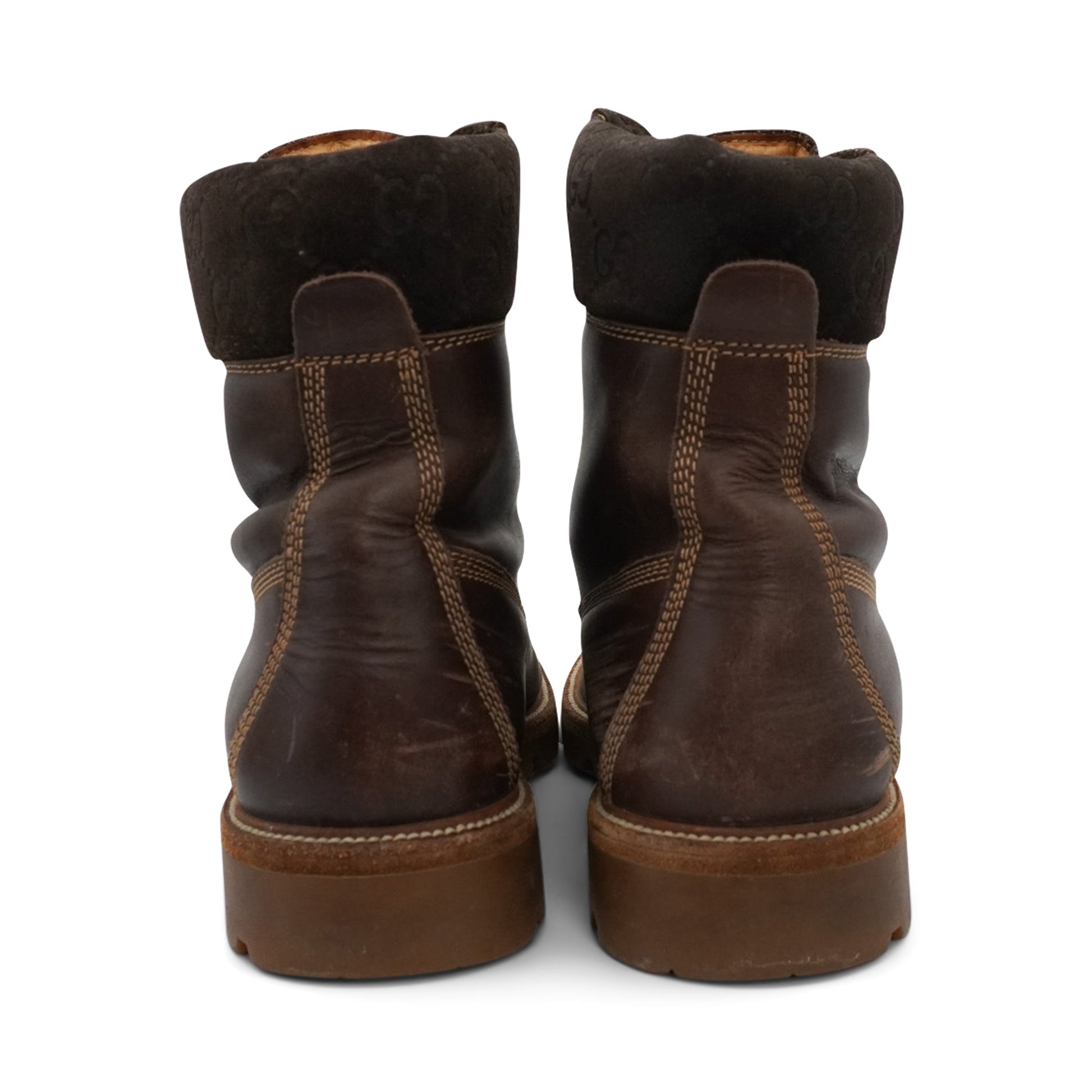 Gucci hiking boots in brown leather with a suede monogram embossed panel at the ankle, brown and orange laces, cream contrast stitching, and brown soles.