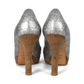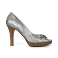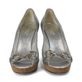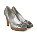 Gucci peeptoe pumps in silver monogram embossed leather with stacked wooden heels and soft gold horsebit hardware.