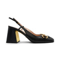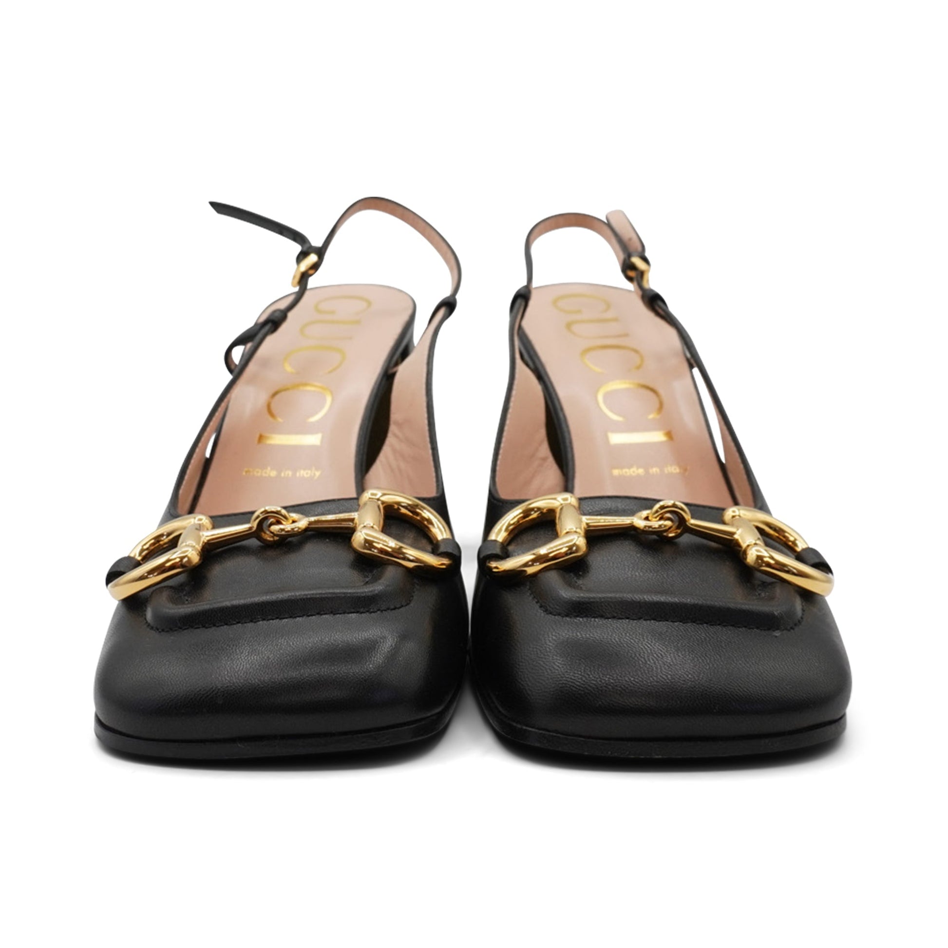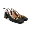 Gucci slingback heels in black leather with a block heel, a square toe, and a large gold Horsebit detail on the upper.