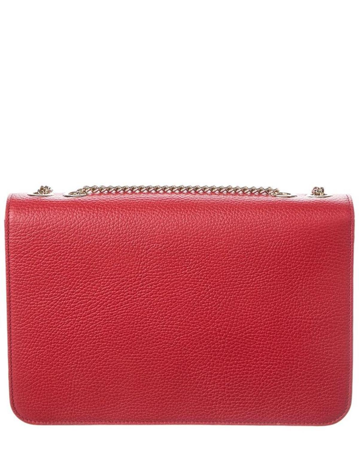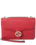 Elevate your style with the Gucci Interlocking G Leather Shoulder Bag. This luxurious handbag is a statement piece that exudes Italian luxury redefined. Made in Italy, this shoulder bag features red leather and light fine gold hardware with the iconic interlocking G logo. The interior is designed with a canvas lining and zippered pocket for easy organization. Measuring 11 inches wide, 7.5 inches high, and 3 inches deep, this shoulder bag is the perfect size for all your essentials. The shoulder strap drops 23 inches, making it comfortable to wear all day. The fold-over flap with turnlock closure adds a touch of sophistication to any outfit.Please note that all measurements were taken by hand and are approximate, so slight variations may occur. Rest assured, our products are genuine. We source our merchandise from trusted independent suppliers to ensure Add this Gucci shoulder bag to your collection for a timeless piece that will elevate any look.