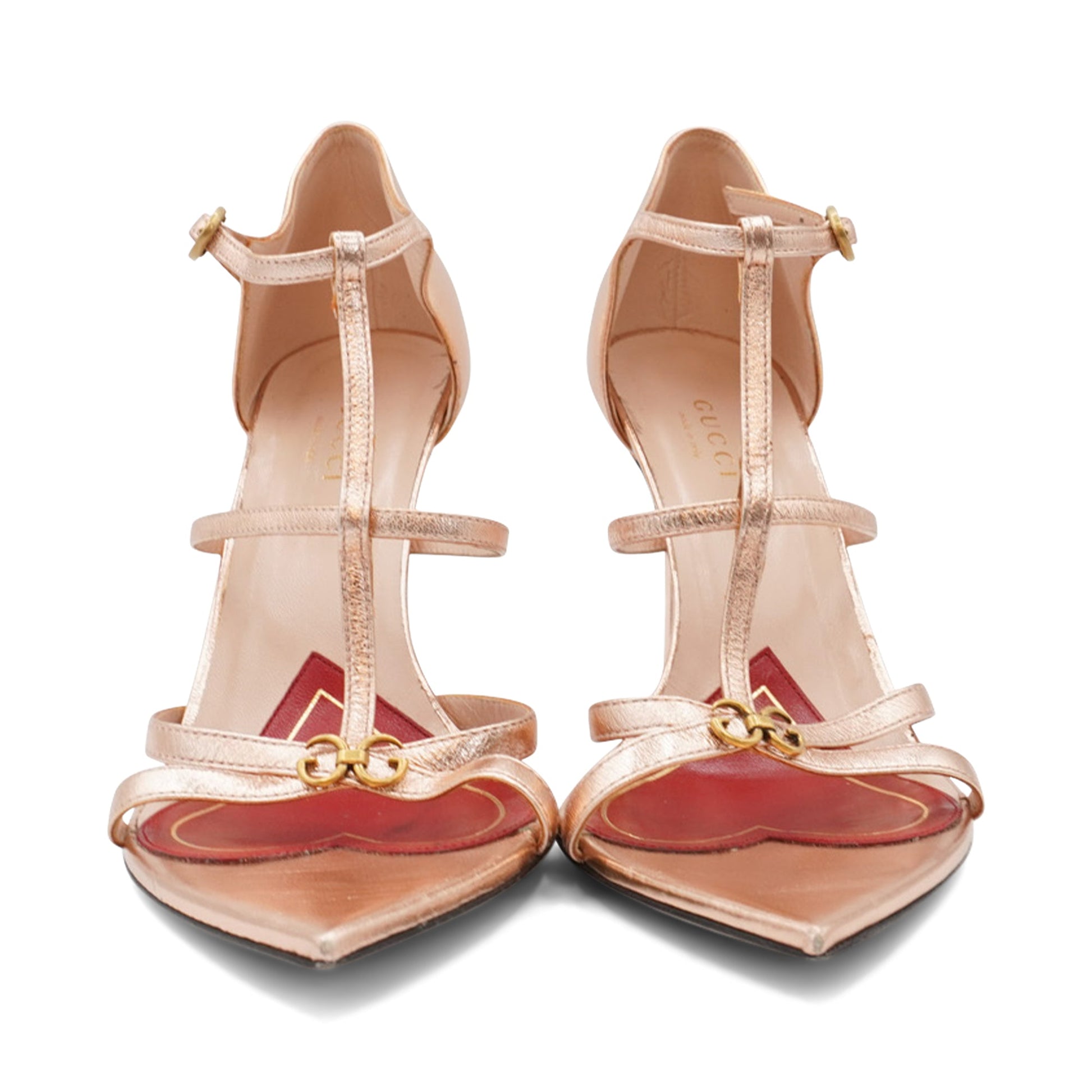 Gucci 'Jerry Cage' pointed-toe heels in rosegold nappa leather with cage straps, a Gucci charm at the toe and ankle fastening. Featuring a decorative heart on the sole in red leather.