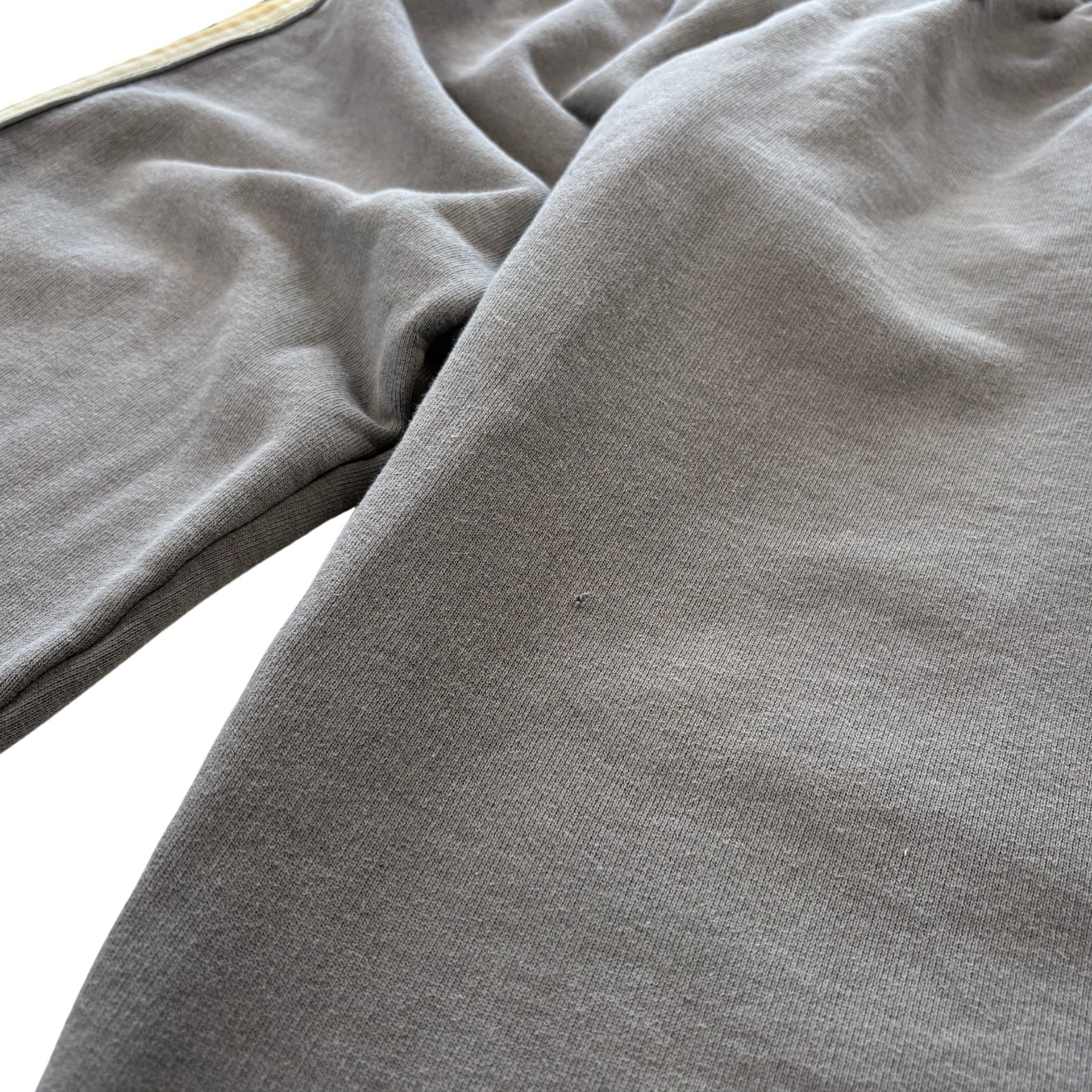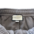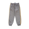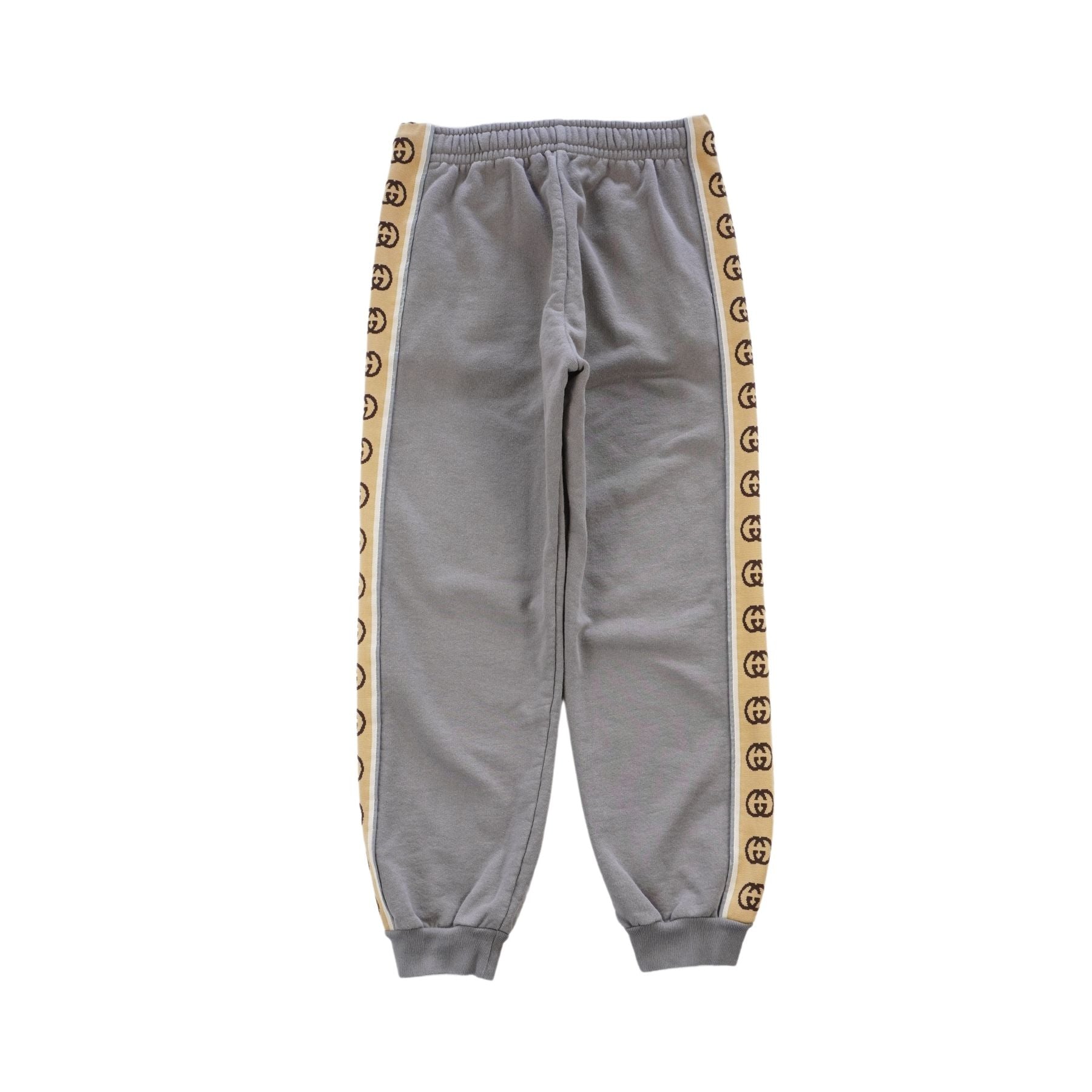 Gucci jogger sweatpants in grey cotton with a beige and brown 'GG' logo stripe down the side seams, an elastic drawstring waistband, and cuffed hems.