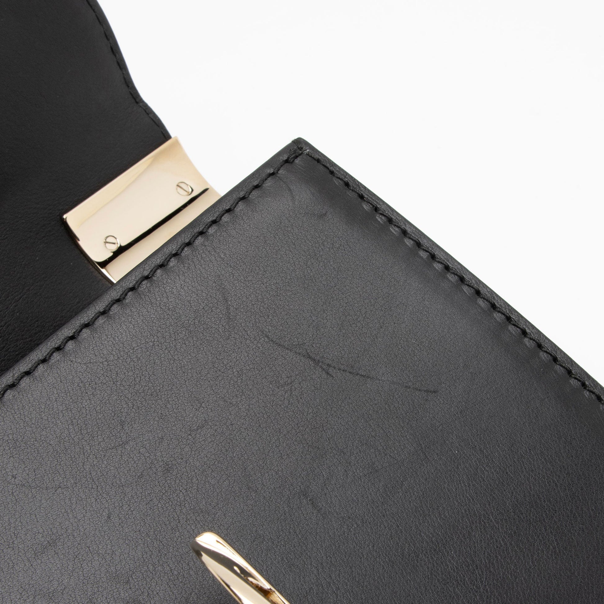 Condition Notes: Moderate scuffs throughout exterior. Scuffs and minor warping throughout handle. Surface scratches to hardware. Moderate scuffs throughout interior flap. Light marks and wear throughout interior.