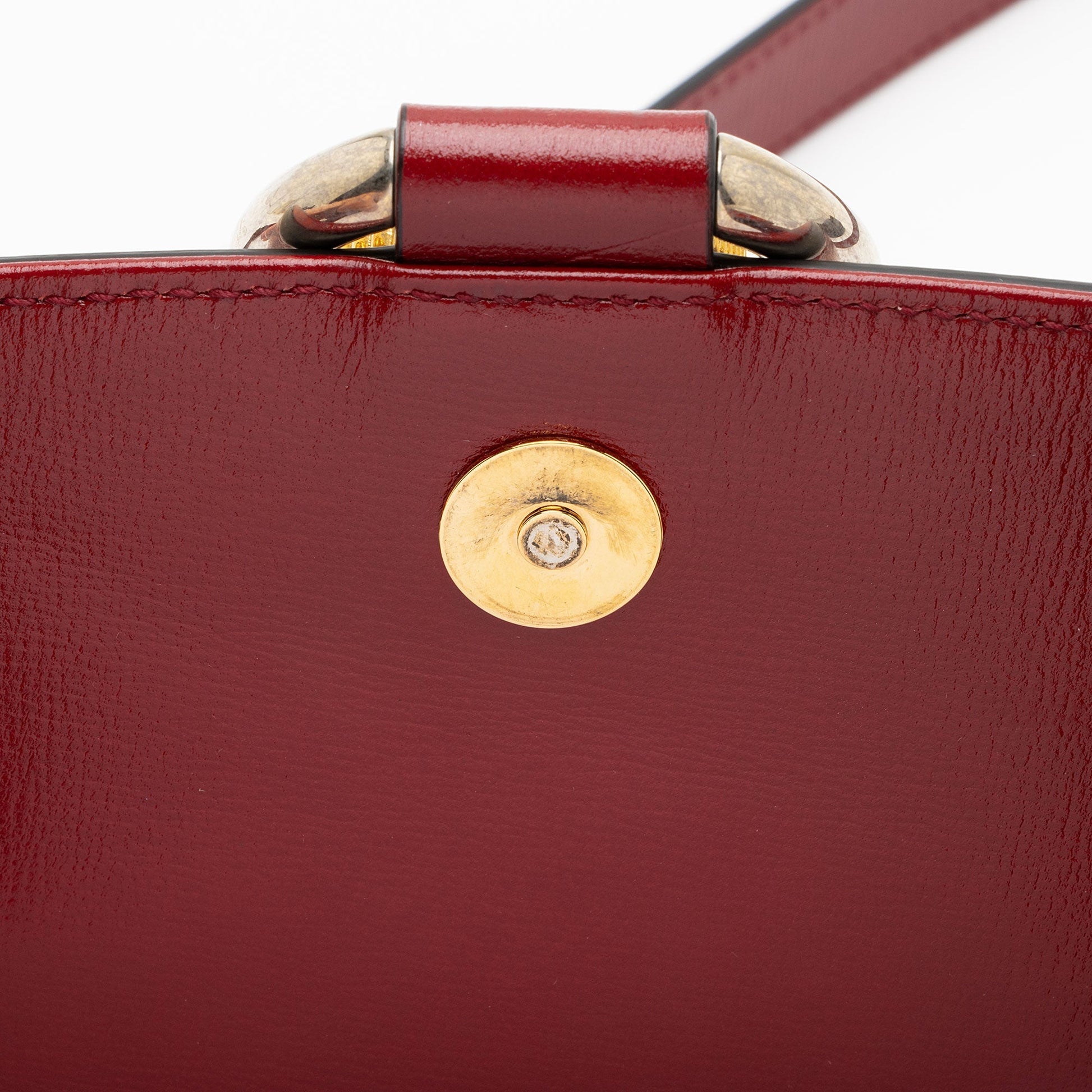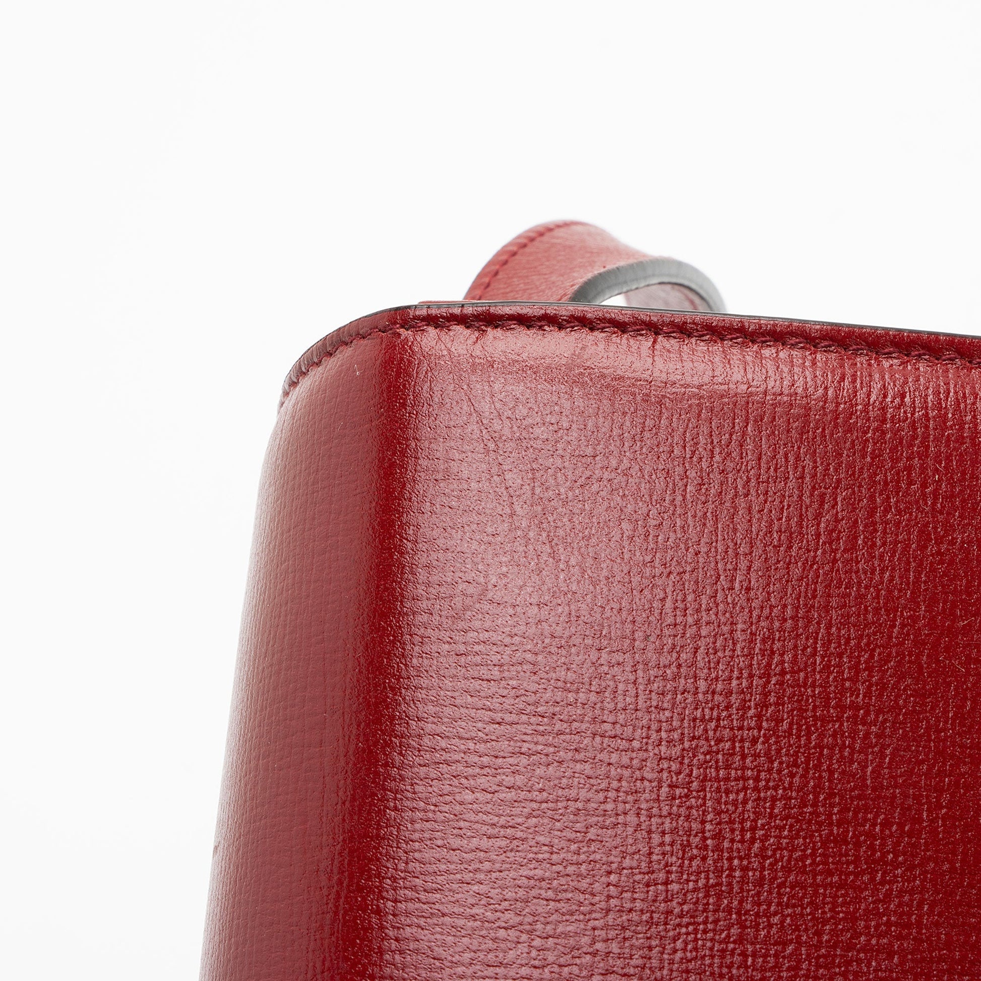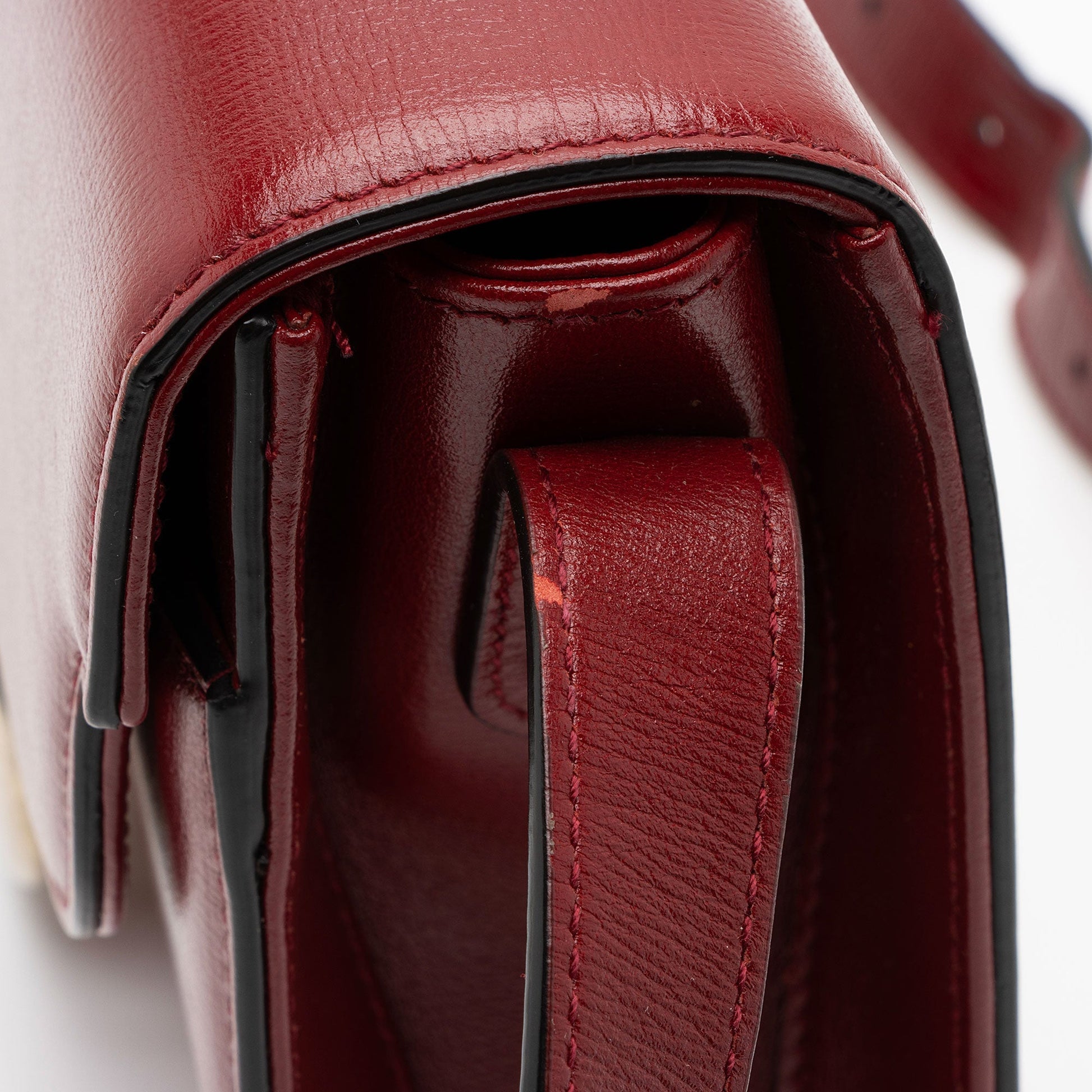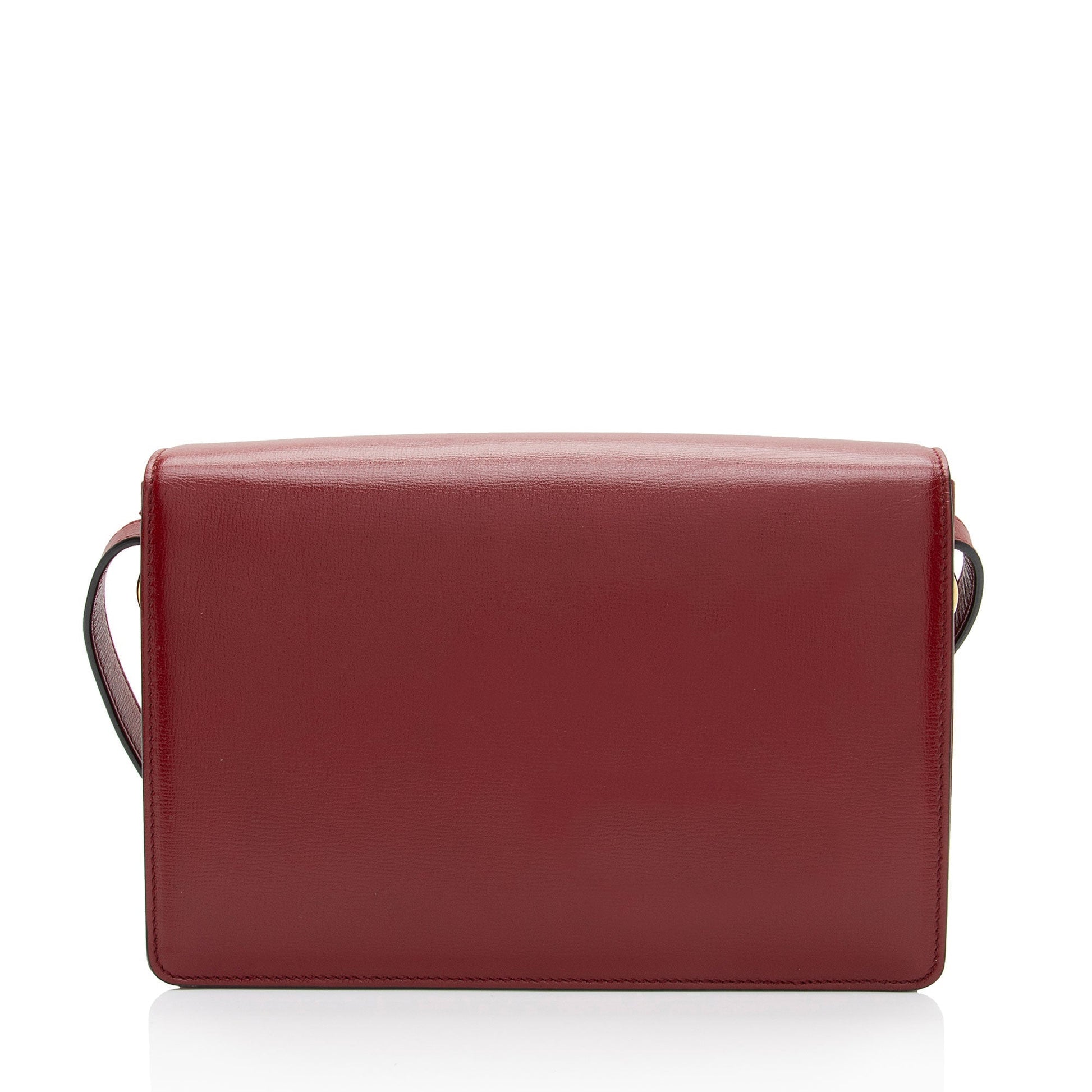 Condition Notes: Light scuffs throughout exterior. Light creasing and minor warping throughout shoulder strap. Surface scratches and tarnishing to hardware. Light scuffs and wear throughout interior flap. Minor wear to interior.