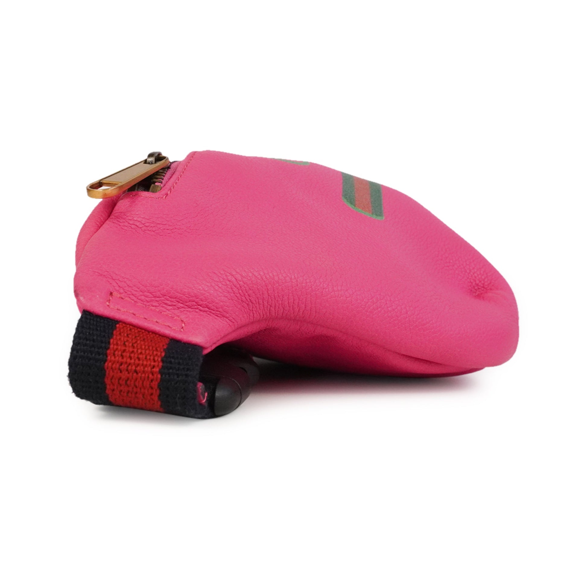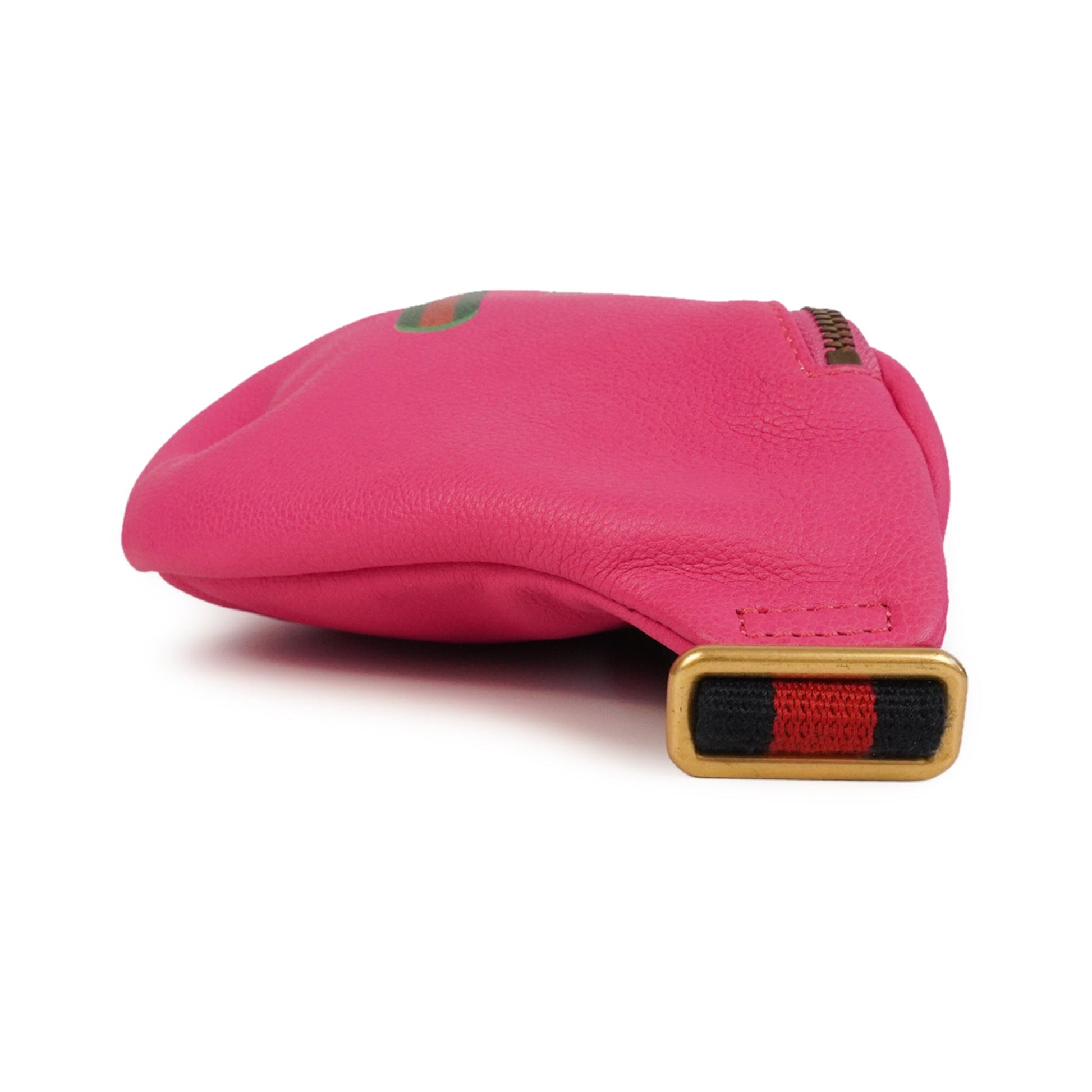Gucci large waist bag in bright pink leather with green and red racing stripe and logo on the front. Features a navy blue and red striped adjustable canvas strap with a black plastic snap buckle, and a gold hardware zip closure on the front. The interior is beige canvas lined.
