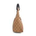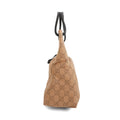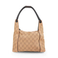 Gucci vintage shoulder bag in camel and dark brown monogram canvas with double rolled straps in dark brown leather. Features a zip closure with elongated leather zipper pull and brown fabric lining.