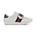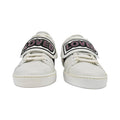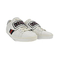 Gucci 'Loved' low top sneakers in white leather with lace up closure, navy and red racing stripe detail with LOVED top strap with black logo and rhinestones.
