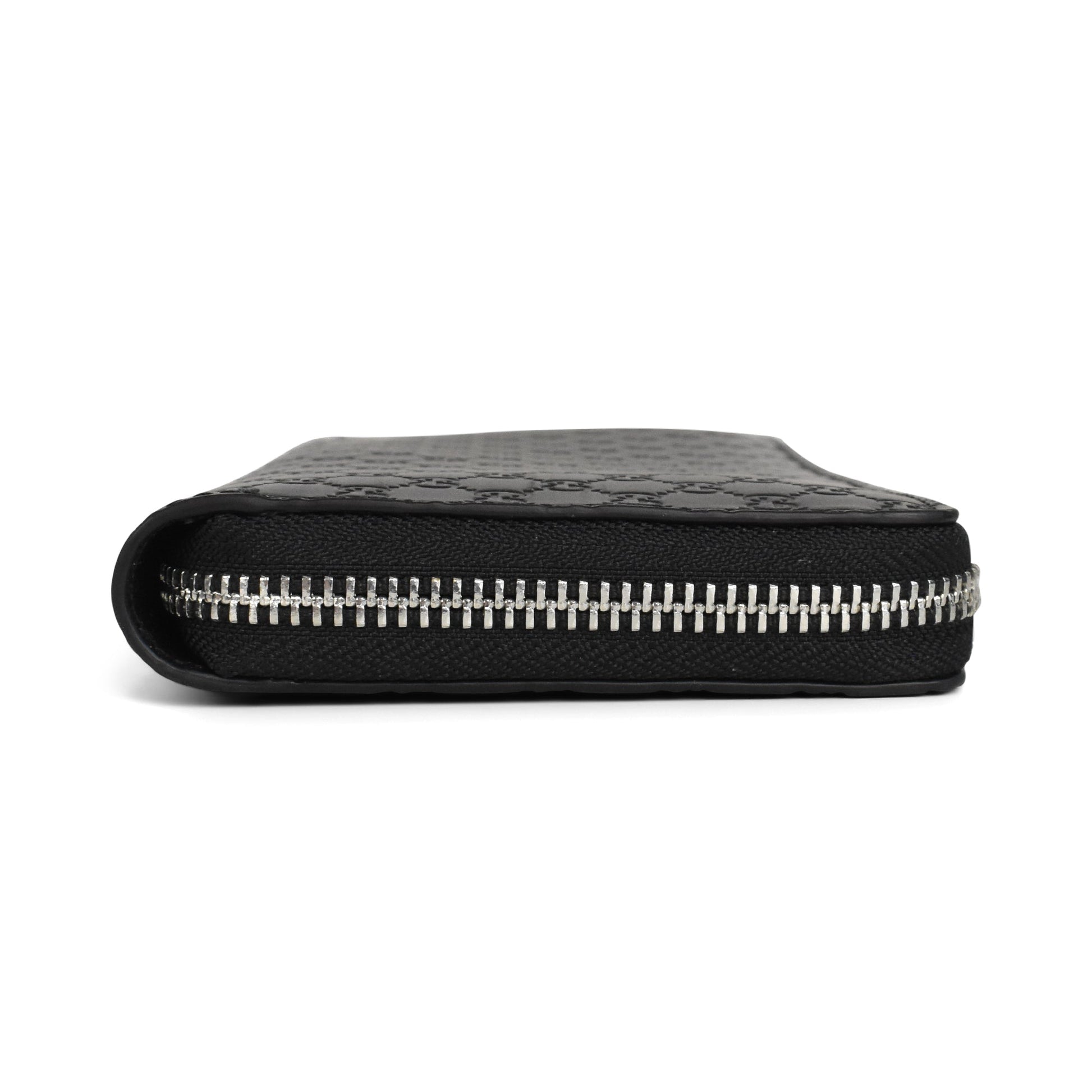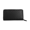 Gucci continental wallet in black 'Microguccissima' embossed leather with a zip-around opening in silver hardware and a black nylon interior lining with various card and zip pockets.