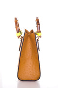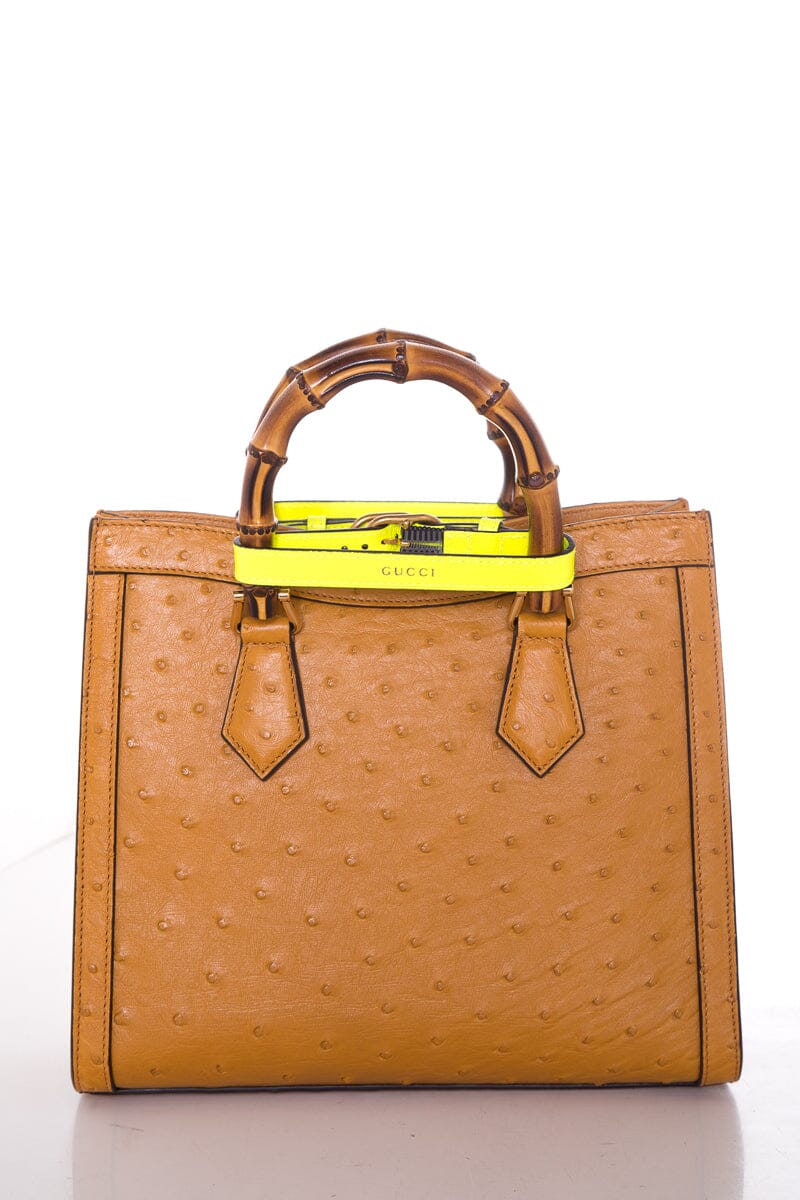 Gucci Limited Edition Mini Diana Tan Ostrich Handbag W/ Bamboo Handles and Contrast Neon Straps; Includes Box and Dust Bag. This item is new with tags.