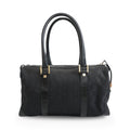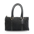 Gucci Mini Duffle Bag in black monogram canvas with leather trim, dual handles and a square clasp in gold hardware. Features a strap lock top zip closure, inner black nylon lining with an inner zipper.