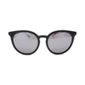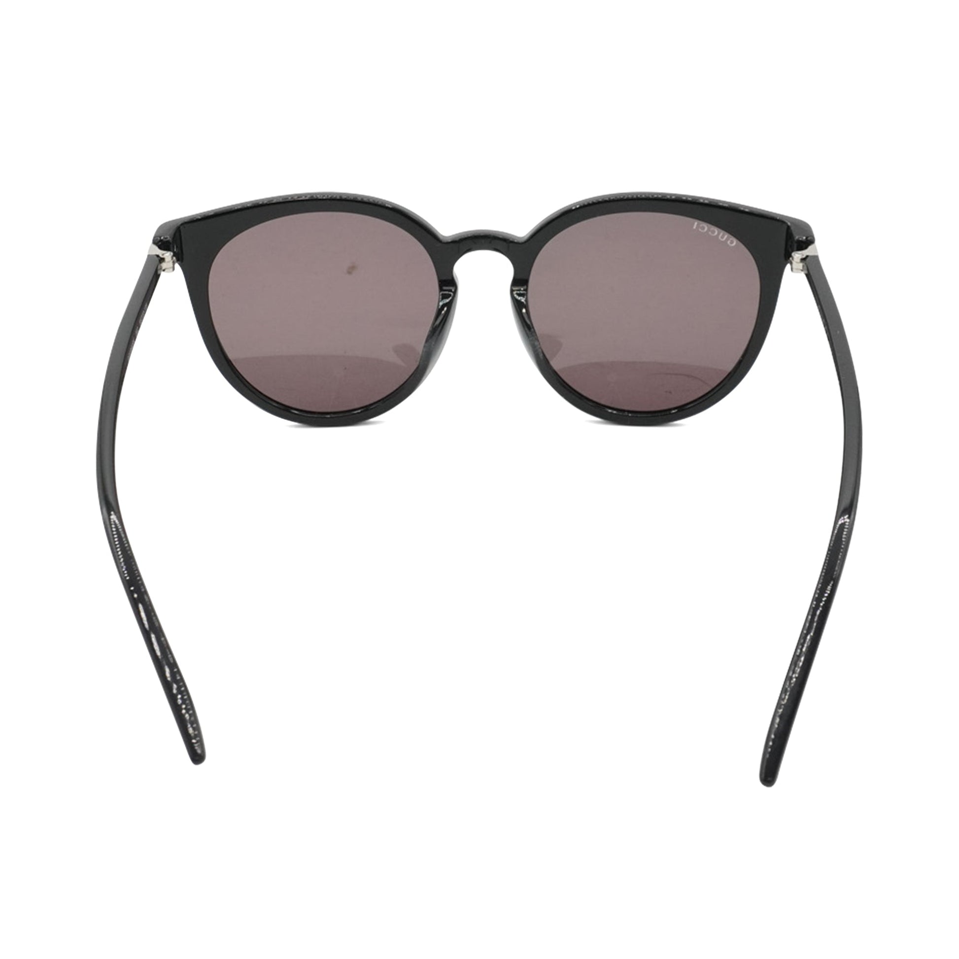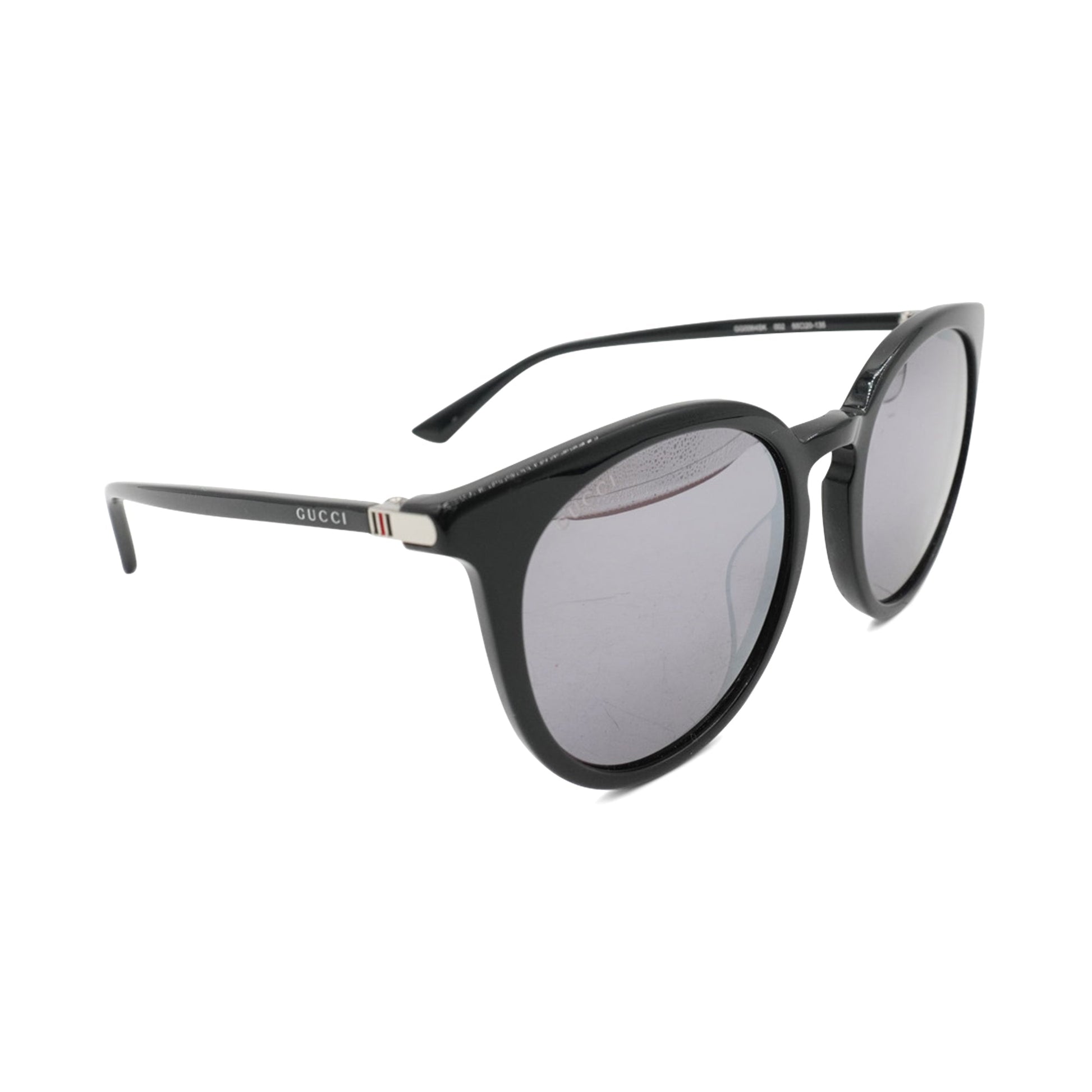 Gucci sunglasses in black acetate with a rounded silver mirrored lens and a silver metal temple detail with red and green racing stripe enamel inlay.