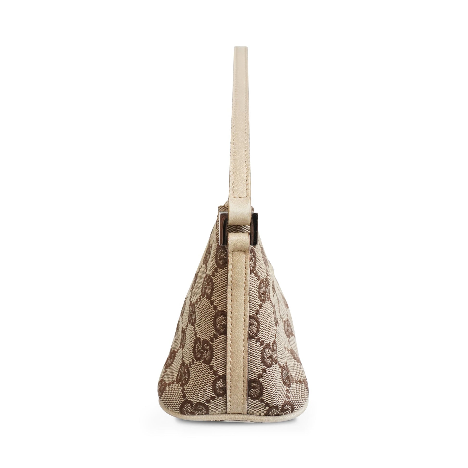 Gucci 'Boat Pochette' shoulder bag in brown monogram printed canvas with a beige leather trim, a leather shoulder strap with gunmetal hardware, a top zip opening, and a brown nylon interior.