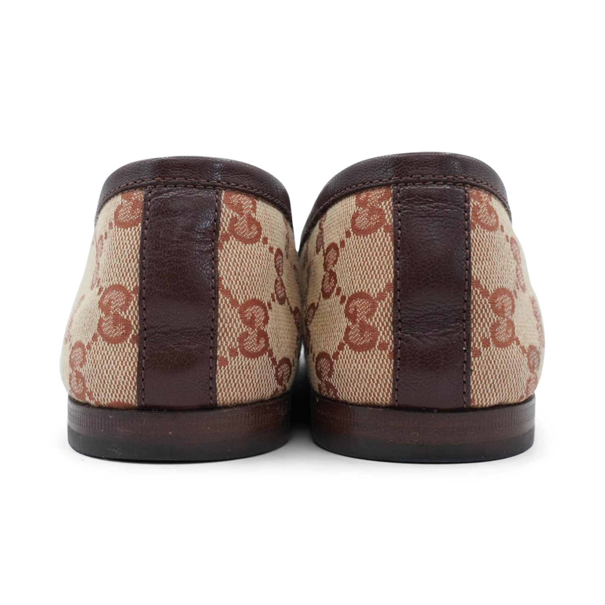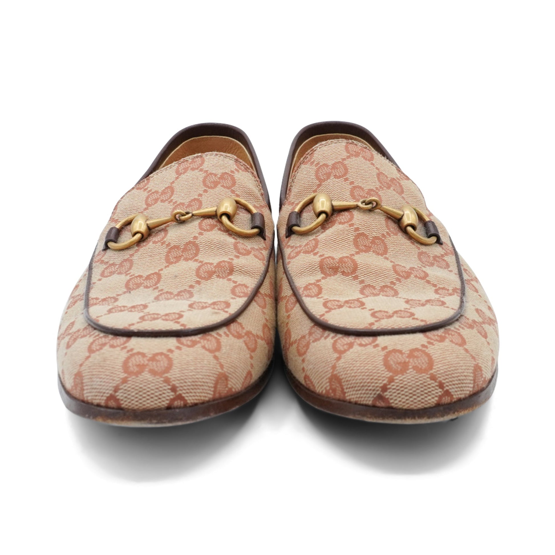 Gucci 'Jordaan' loafers in beige monogram printed canvas with brown leather trim and a gold horsebit buckle on the front.