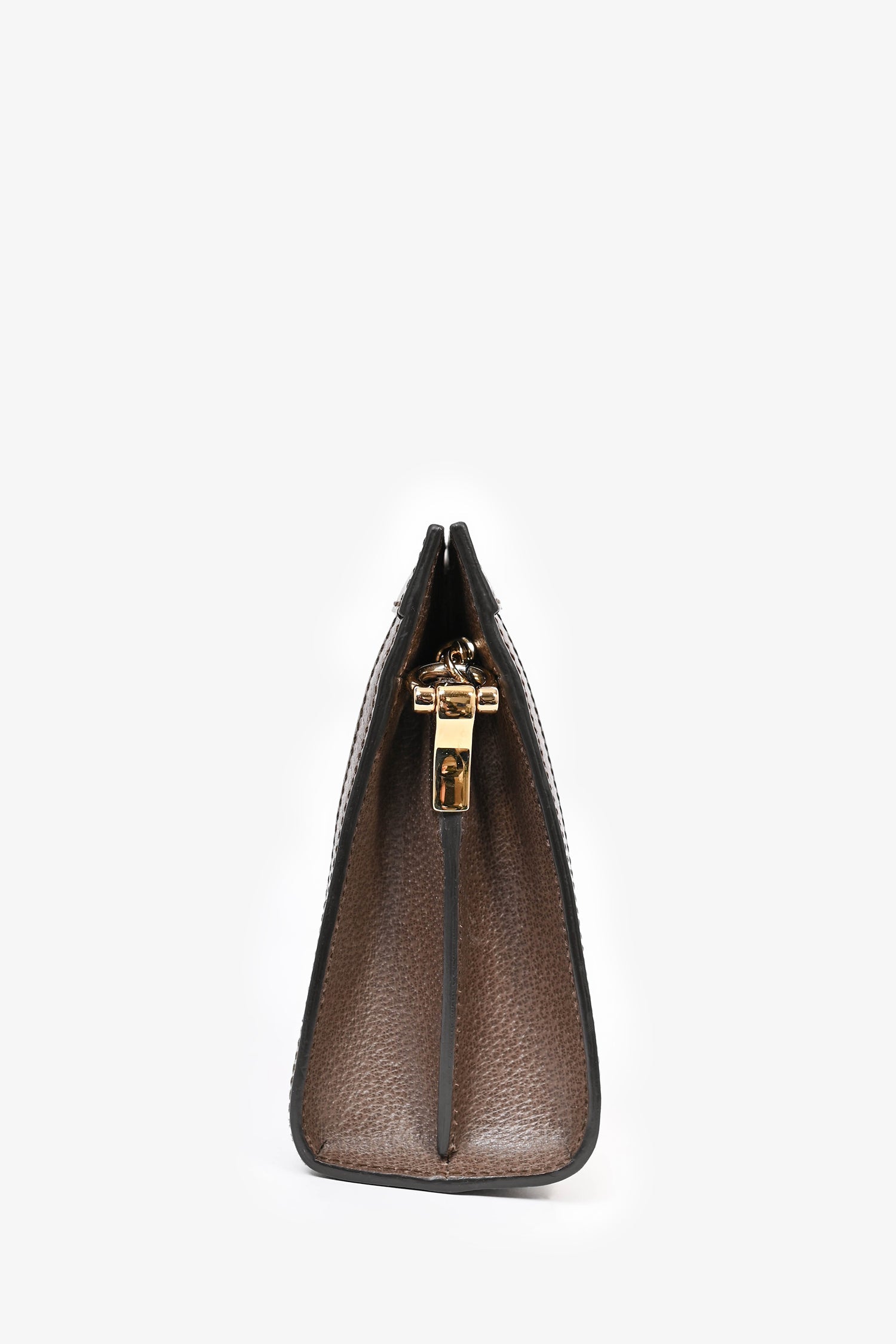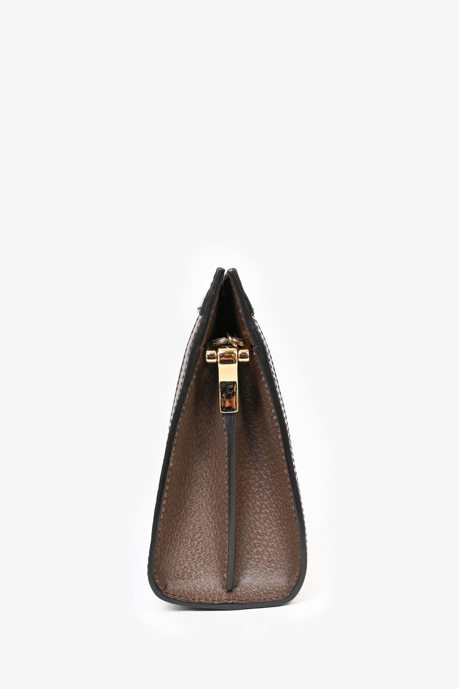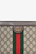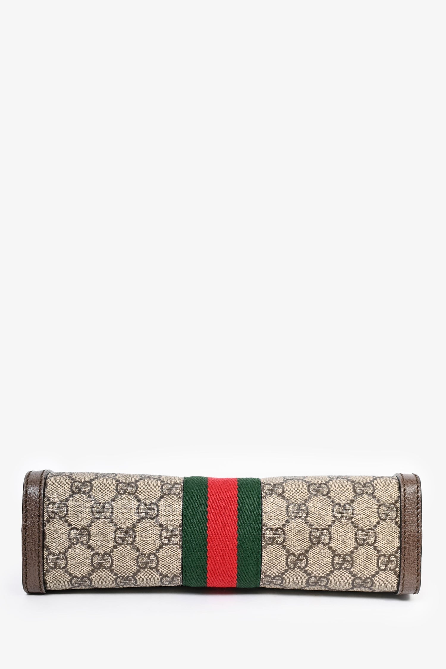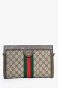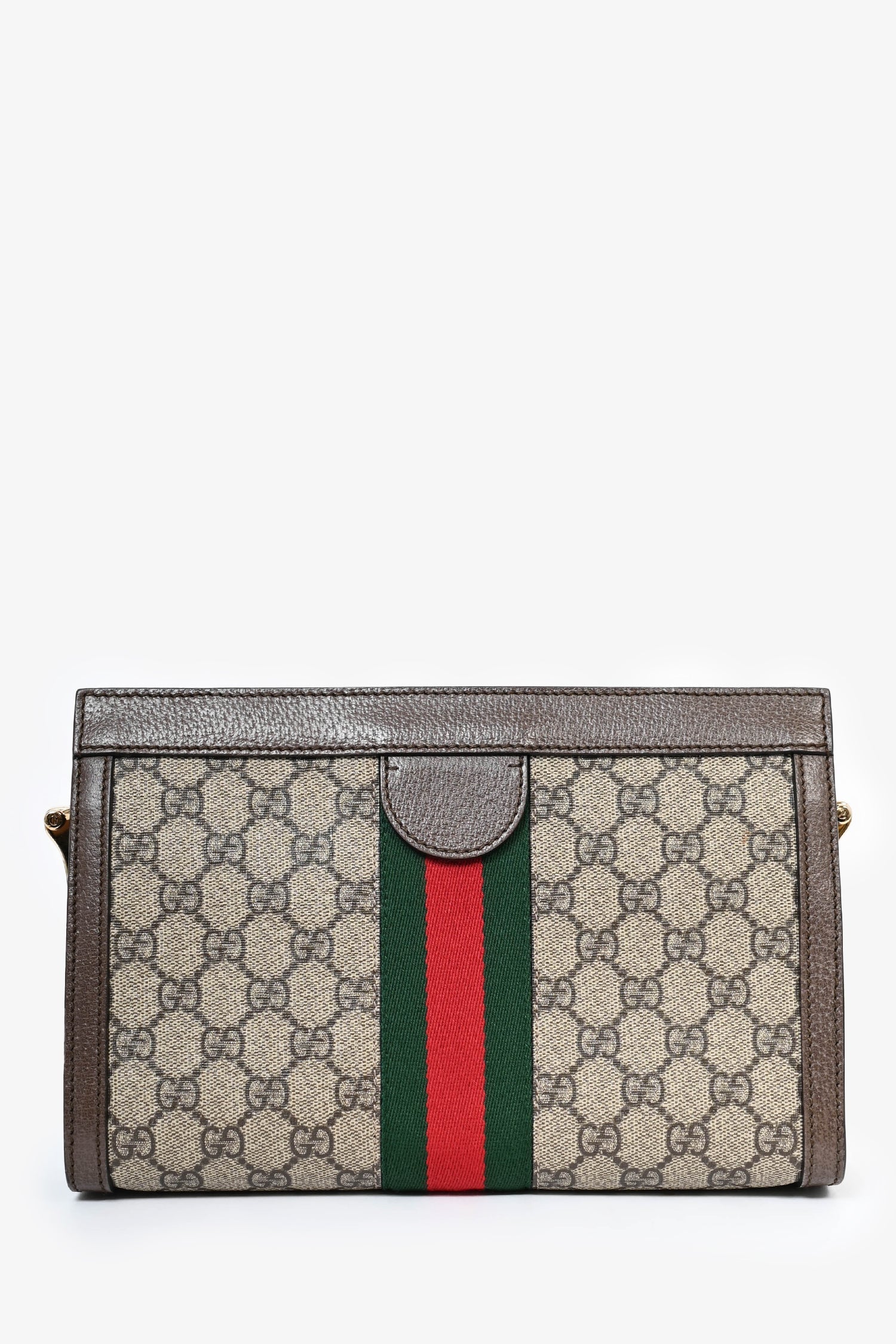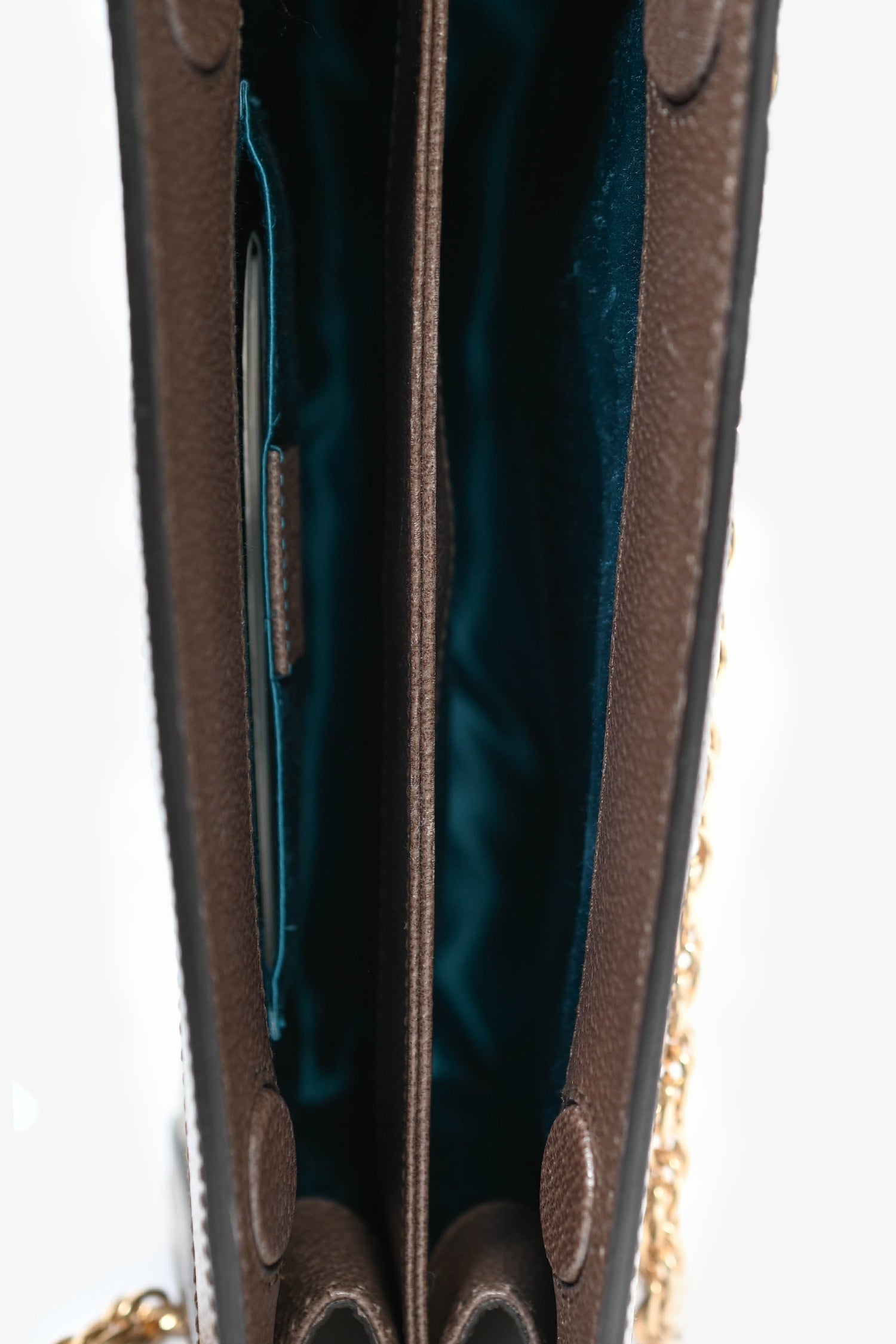 Gucci Monogram Ophelia Small Shoulder Bag. Top magnetic closure. Teal textile interior lining. 2 interior compartments; separated by a divider. Single interior wall slip pocket. Gold-tone hardware.