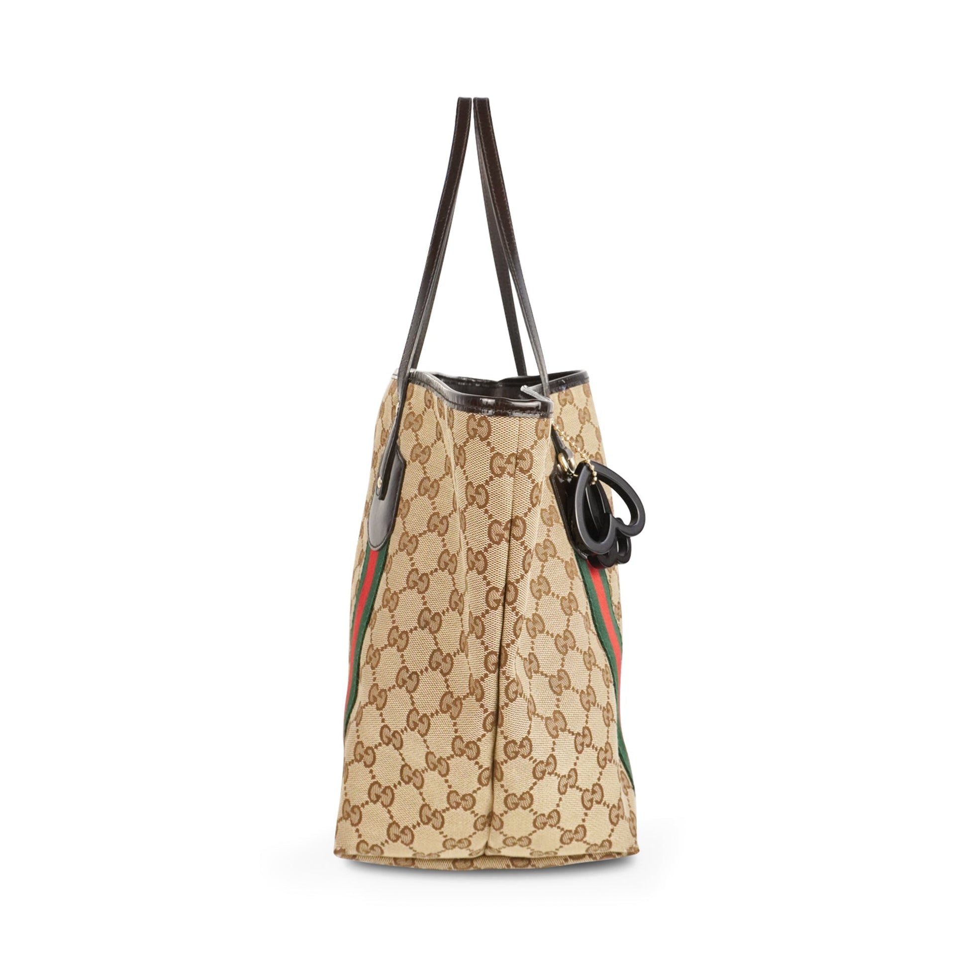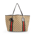 Gucci tote bag in beige and brown logo monogram canvas with red and green racing stripe detailing. Features dark brown patent leather trim, two thin flat handles, and brown plastic 'I' and heart charm. The interior is brown fabric lined with a zip pocket and small slip pocket.