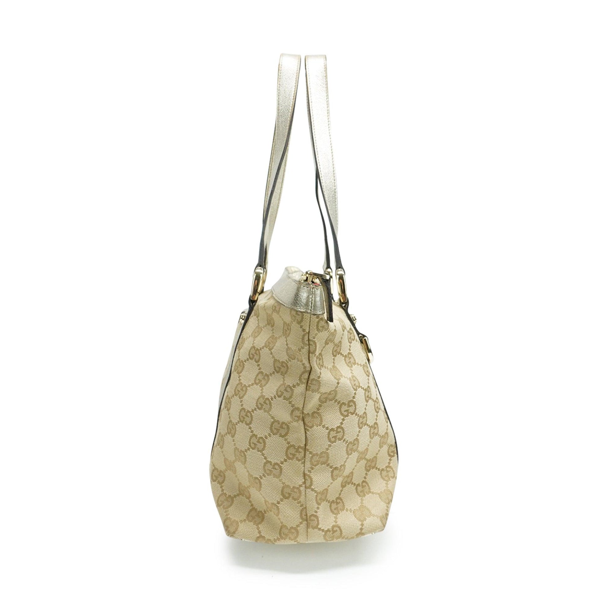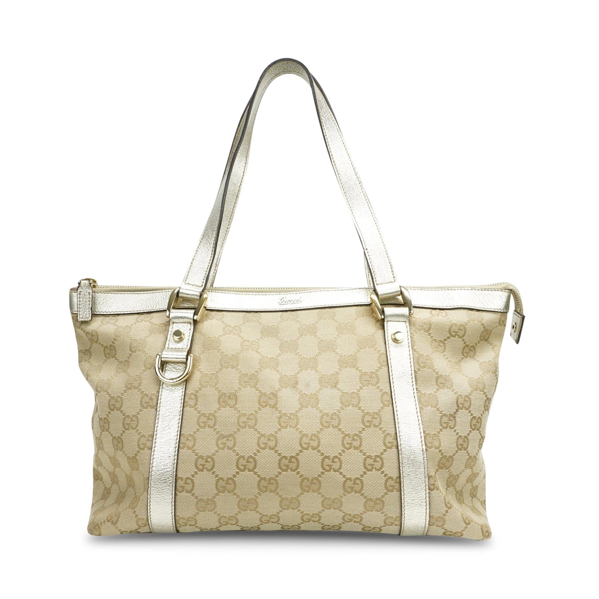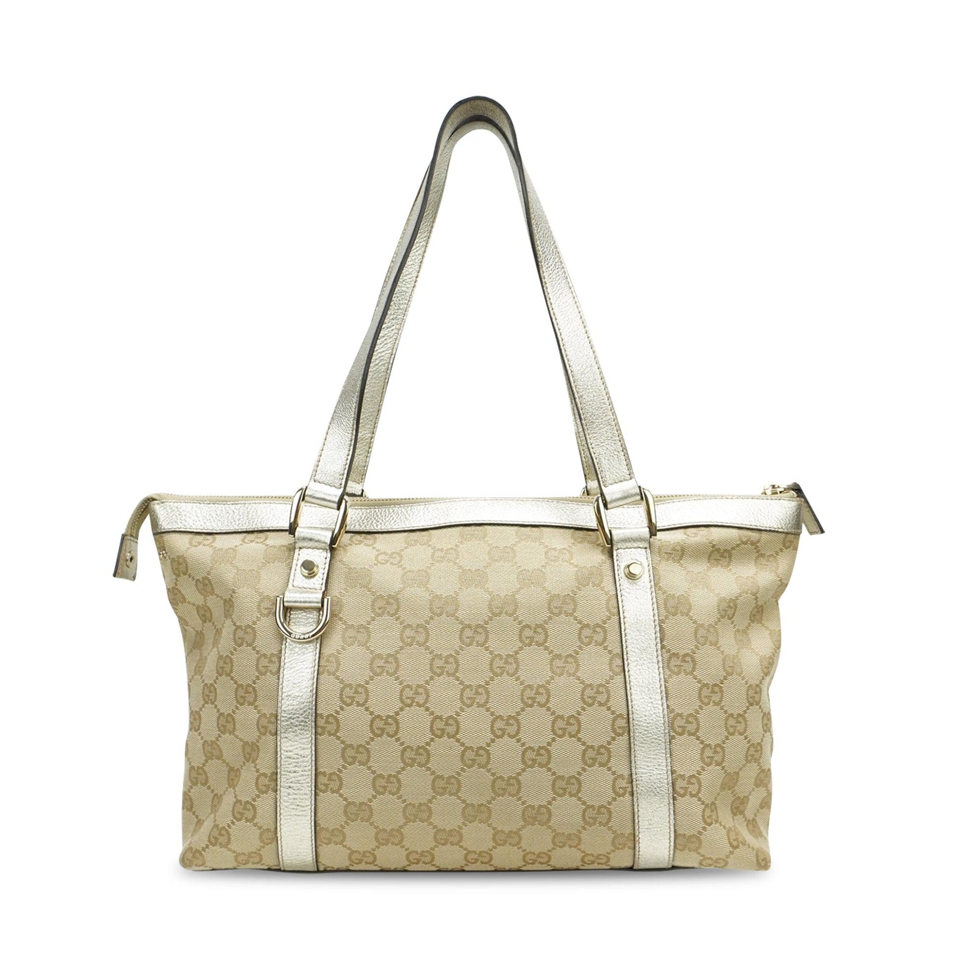 Gucci Tote Bag in monogram canvas with soft metallic gold trim, black piping, logo embossing and top zip closure. Features dual handles, stripped canvas lining and an inner zipper pocket.