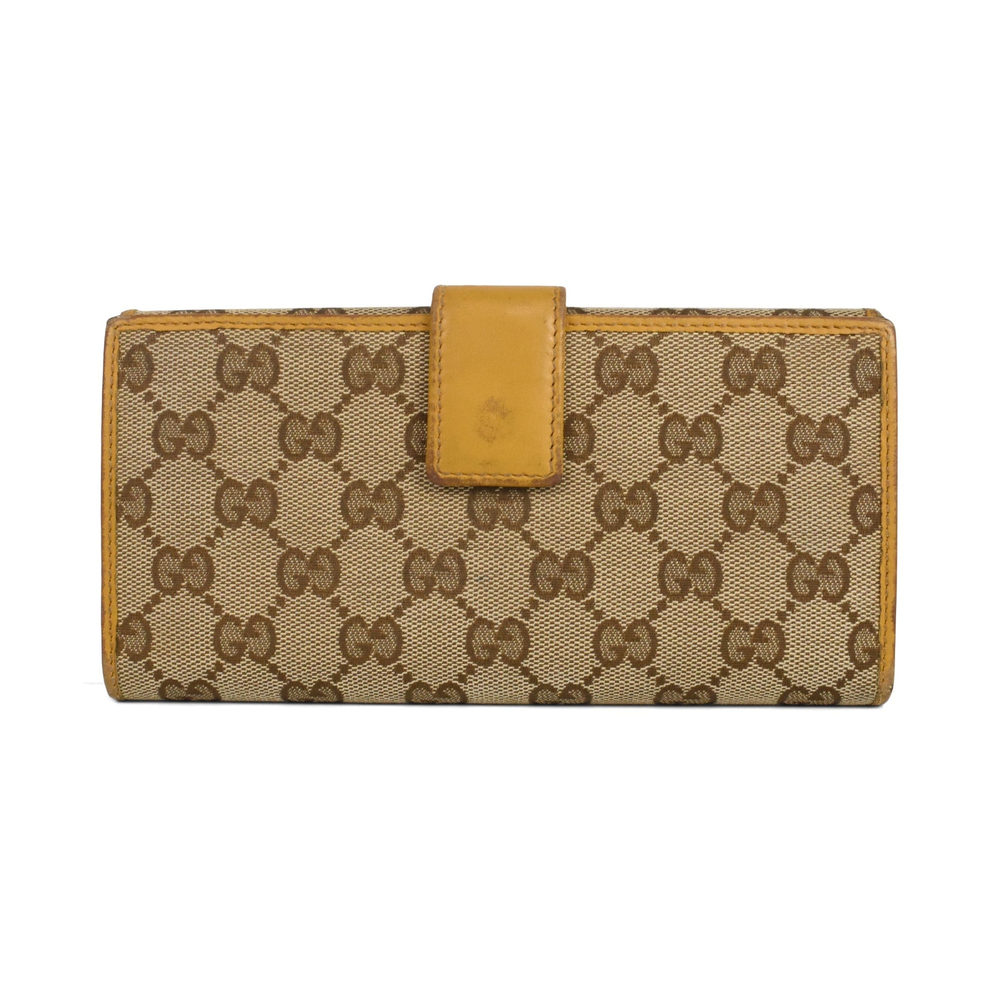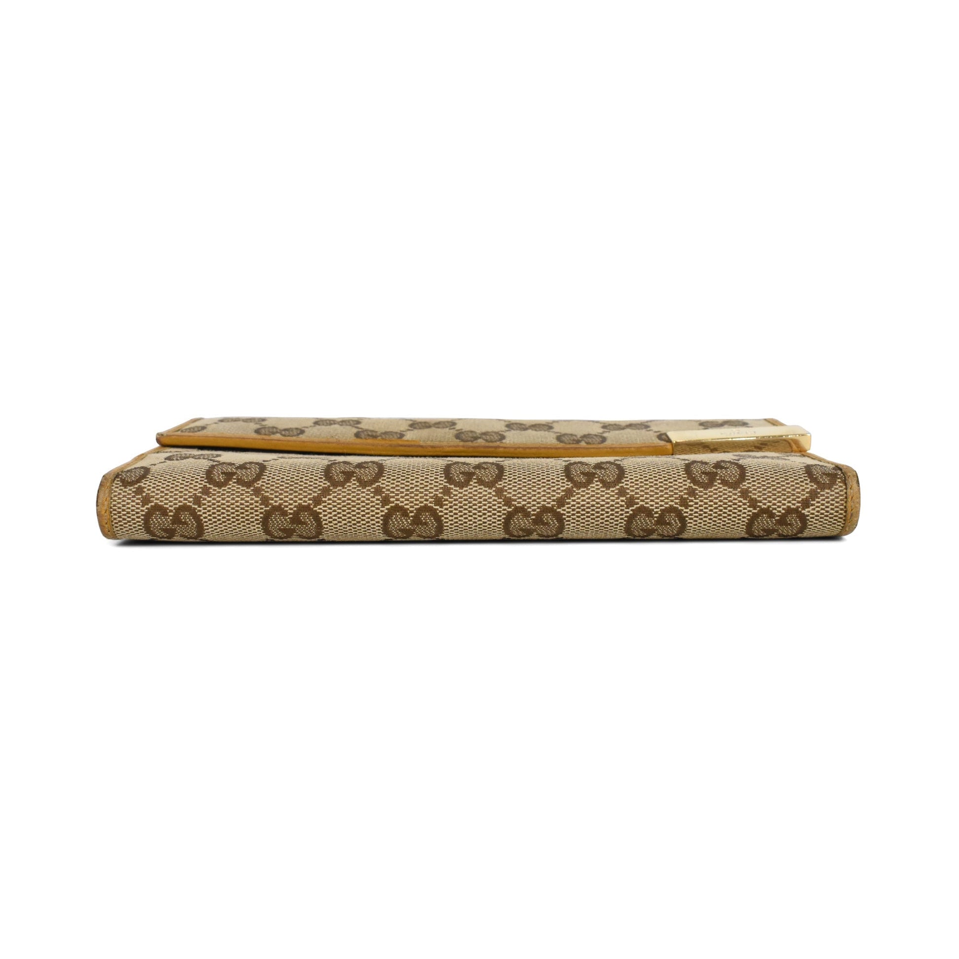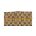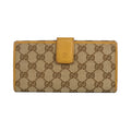 Gucci long wallet in beige 'GG' monogram printed canvas with a tan leather trim, a front flap pocket with gold logo plaque hardware, and a back leather lined compartment with several card pockets and a snap closure.