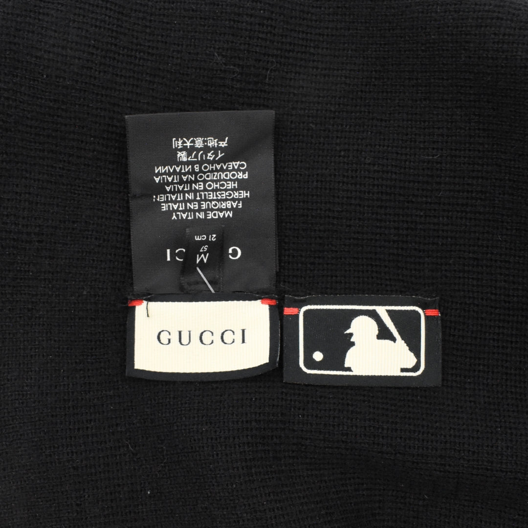 Gucci x MLB 'New York Yankees' toque in black wool with embroidered NY logo and flowers, as well as a rubberized Gucci logo on the back.