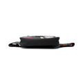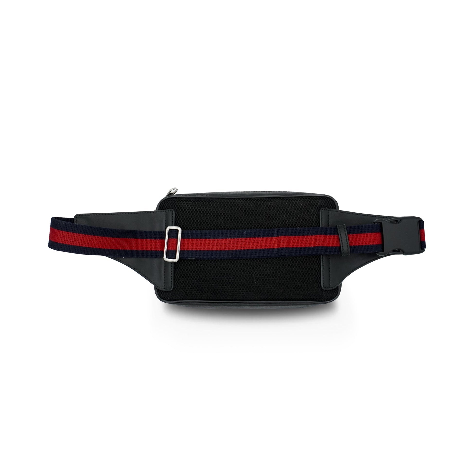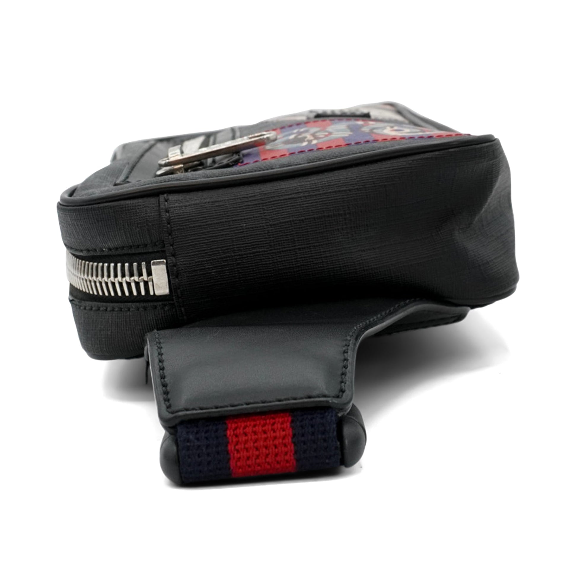 Gucci 'Night Courrier' waist bag in black and grey 'GG' monogram printed coated canvas with black leather trim, graphic patches on the front and sides, and an adjustable rd and navy canvas strap. The bag has a front zip pocket, a back mesh panel, and a top zip opening in silver hardware revealing a black canvas lined interior.
