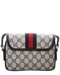 Elevate your style with the Gucci Ophidia Mini GG Supreme Canvas & Leather Shoulder Bag. Crafted in Italy, this exquisite handbag features the iconic GG Supreme canvas and navy leather with dark silver hardware and a striking interlocking G logo accent. The red and blue signature webbing stripe adds a pop of color to this luxurious design. The interior boasts a chic canvas lining and a zippered pocket for storing your essentials. The adjustable shoulder strap allows for a customizable fit, while the fold-over flap with magnetic closure keeps your belongings secure. This compact yet stylish bag measures 7.5 inches wide, 5 inches high, and 2 inches deep. Please note that all measurements are approximate. Shop with confidence knowing that our products are genuine, sourced from trusted independent suppliers. Experience Italian luxury redefined with Gucci, a brand known for its eclectic and coveted designs.