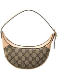 Elevate your style with the Gucci Ophidia Mini GG Supreme Canvas & Leather Shoulder Bag. This luxurious handbag is a statement piece that exudes Italian luxury redefined. Made in Italy with horsebit striped GG Supreme canvas and light pink leather, this bag features light fine gold hardware for a touch of elegance. The interior is lined with taffeta and includes card slots for easy organization. Measuring 8 inches wide by 6 inches high and 2 inches deep, this bag is the perfect size for carrying your essentials. The adjustable shoulder strap has a 6 inch drop for customizable comfort. With a zipper closure, your belongings will stay secure while you're on the go. Please note that all measurements are approximate and slight variations may occur. Rest assured that our products are genuine, sourced from trusted independent suppliers. Add this Gucci shoulder bag to your collection for a truly covetable accessory.