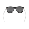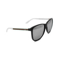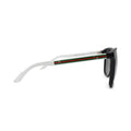 Gucci rounded cat-eye sunglasses with black acetate frames and silver mirrored lenses. Features white acetate arms with green and red racing stripes and silver 'G' logo.