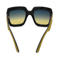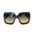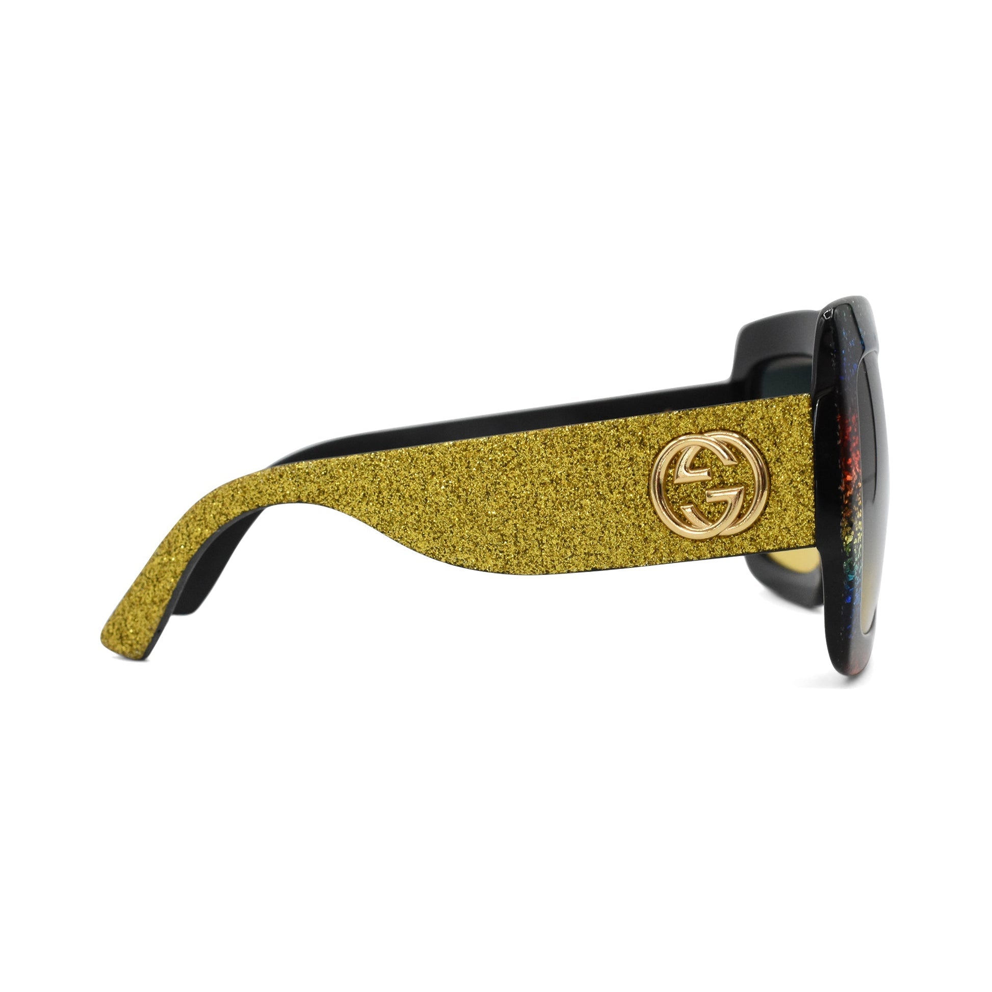 Gucci oversized square sunglasses in rainbow glitter acetate frames and green-yellow tinted lenses. Features thick arms with yellow glitter and gold hardware logos.
