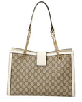 Introducing the Gucci Padlock GG Supreme Medium Canvas & Leather Shoulder Bag. Made in Italy, this stunning shoulder bag is designed for the stylish woman who values quality and luxury. Crafted with GG Supreme canvas and white leather, this bag is a perfect blend of elegance and sophistication. With its light fine gold hardware, it exudes a touch of glamour in every detail. The interior of the bag features a soft suede lining and convenient interior pockets, ensuring that your belongings stay organized and within reach. Measuring 13.5 inches wide, 9.5 inches high, and 5.5 inches deep, this medium-sized bag provides ample space for your daily essentials. The removable shoulder straps, with a drop of 12 inches, offer versatility in how you carry it.The fold-over flap with the iconic Gucci pushlock closure adds a touch of security and style. Please note that all measurements were taken by hand, and slight variations may occur.Rest assured, our products are genuine. While some items are purchased from trusted independent suppliers, we the ity of every product sold on our site. Indulge yourself in the world of Gucci with this exquisite Padlock GG Supreme Medium Canvas & Leather Shoulder Bag. Elevate your ensemble and make a statement of luxury with this iconic Gucci piece.