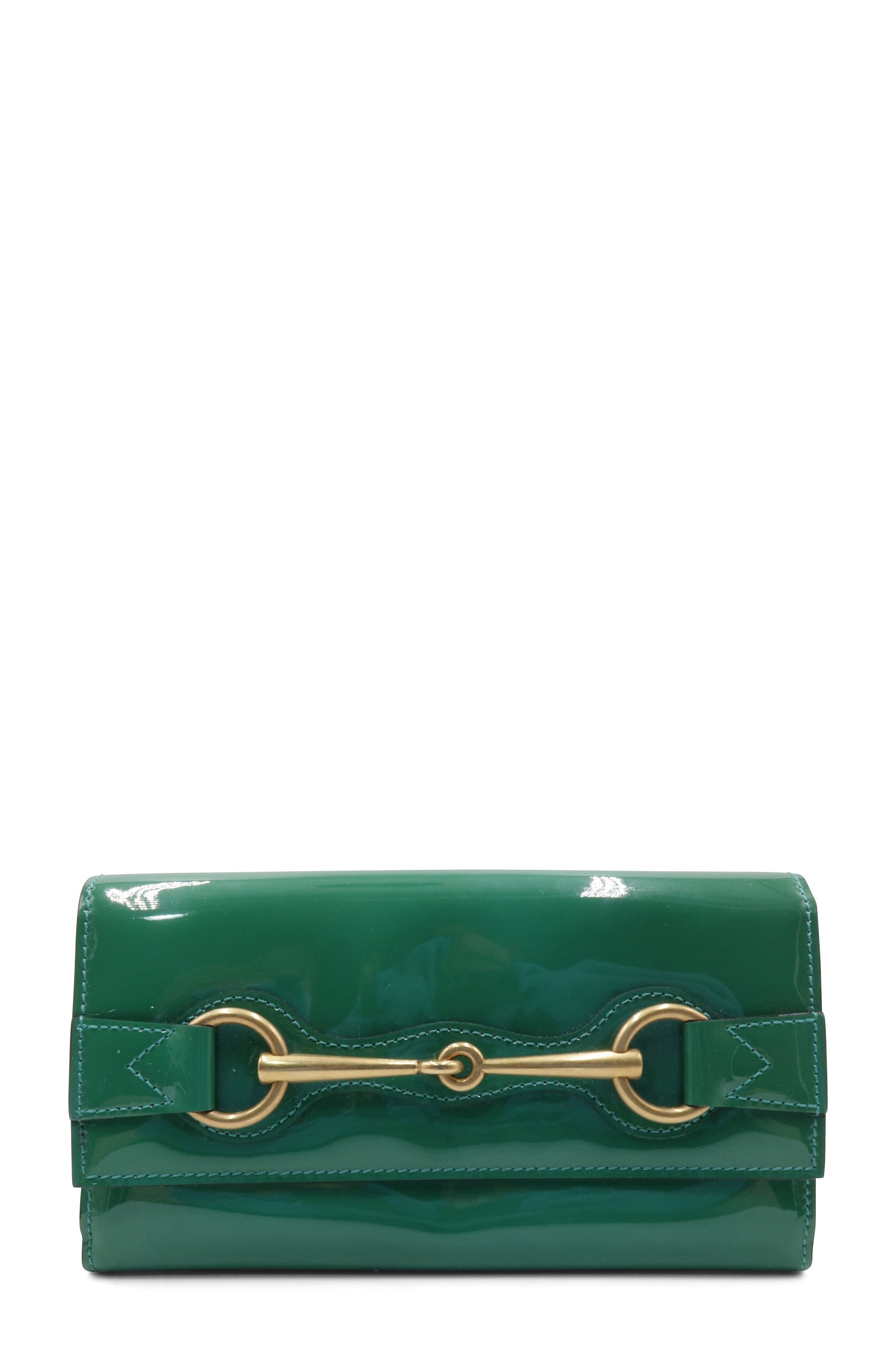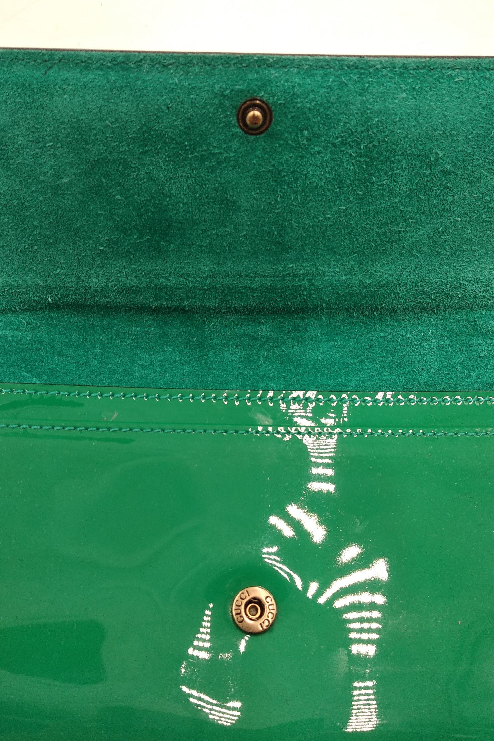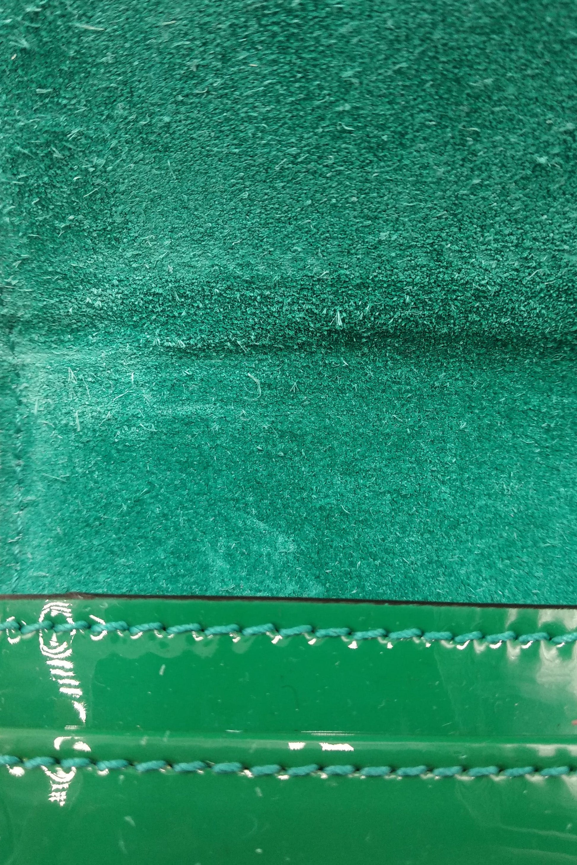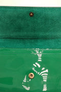 This is a stylish evening clutch is crafted of green patent leather with a front aged brass horsebit detail. The front flap opens to a green suede interior with a zipper pocket and patch pockets.